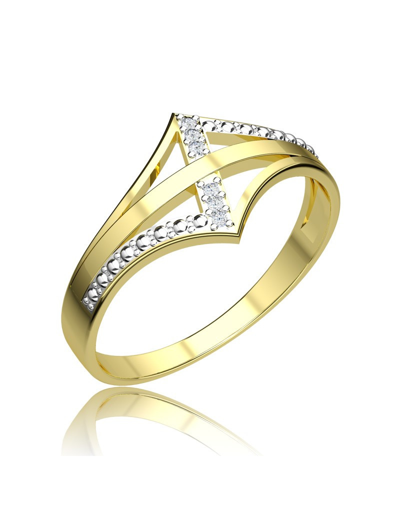 Finezyjny złoty pierścionek o nowoczesnych kształtach z brylantami które dodają mu blasku.