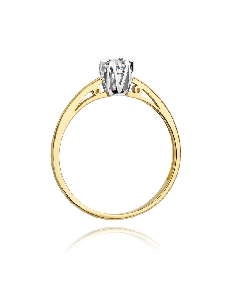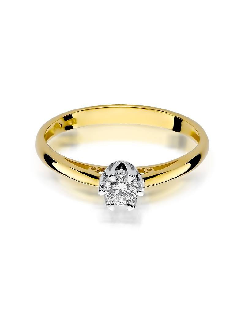 Elegancki pierścionek z żółtego złota z lśniącym brylantem w sześcioramiennej koronie z białego złota.