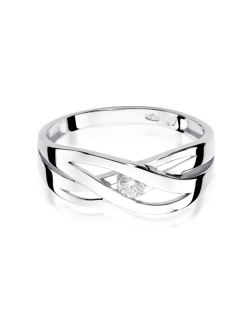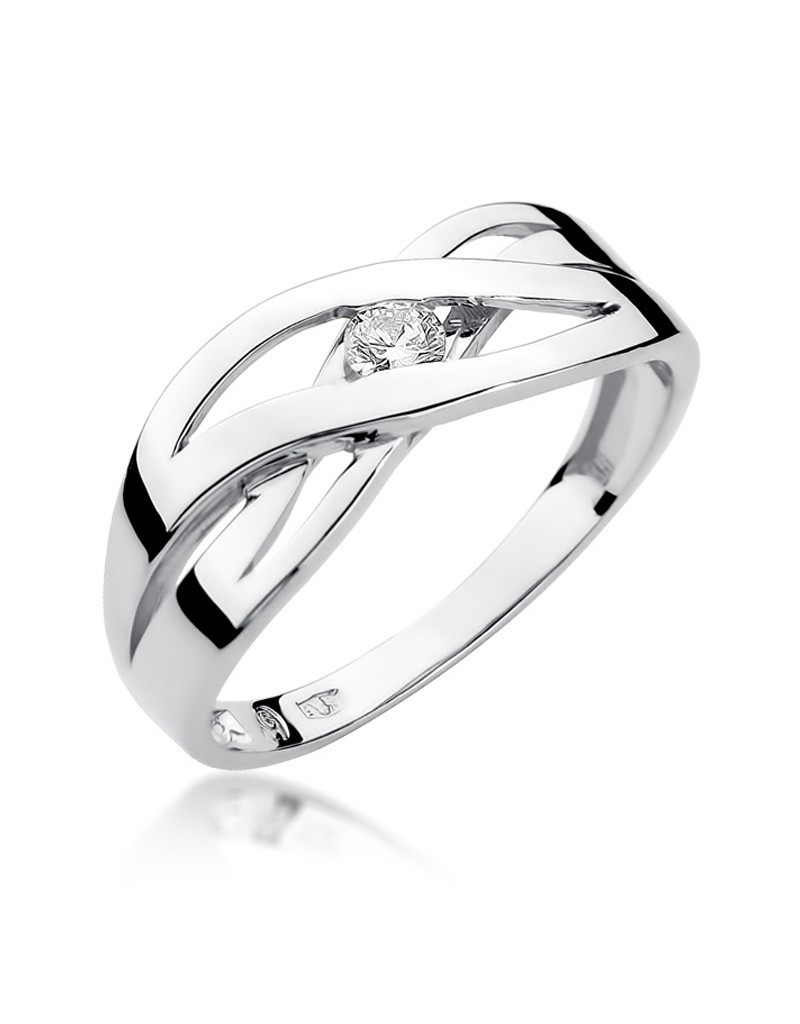 Nietuzinkowy pierścionek z białego złota, ozdobiony falowaną szyną oraz brylantem dodającym uroku.