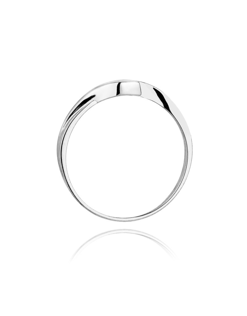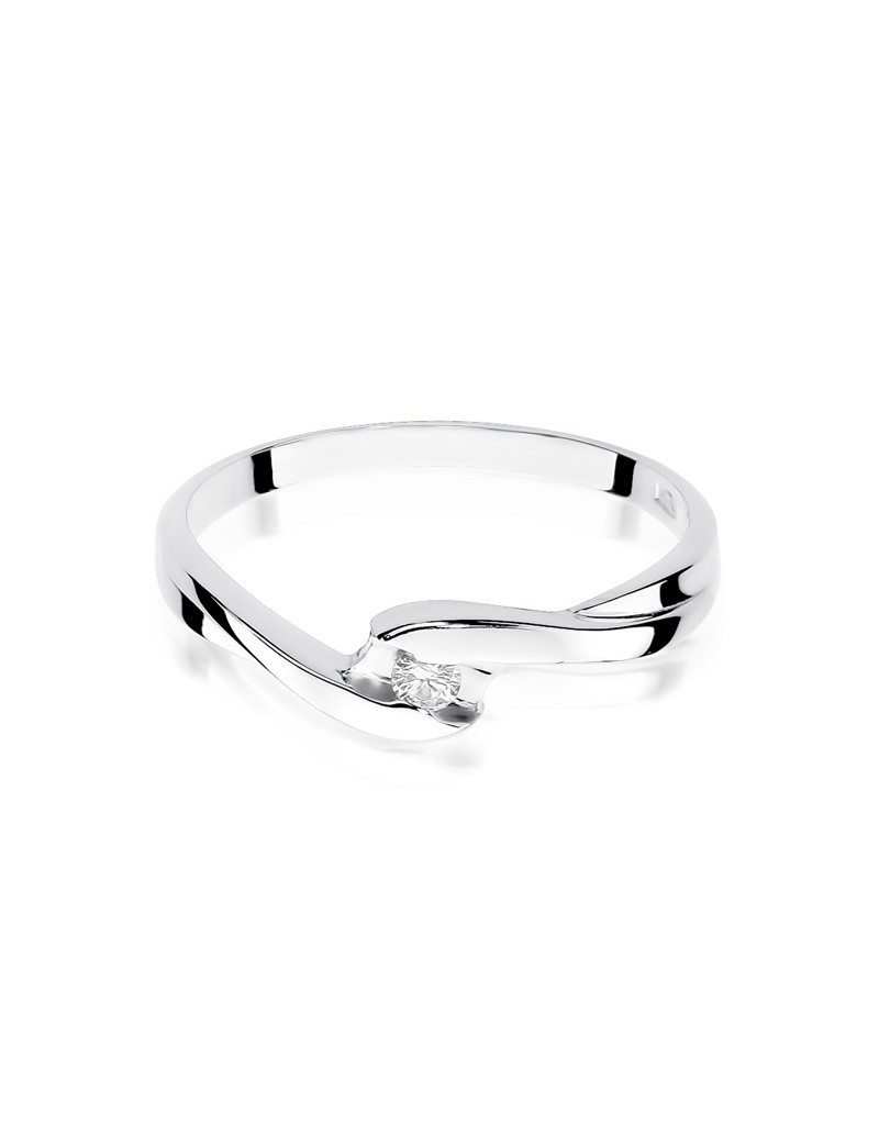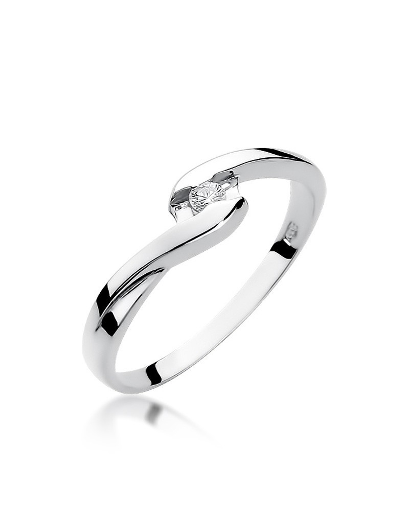 Gustowny, pierścionek z białego złota z brylantem osadzonym w delikatnej formie.