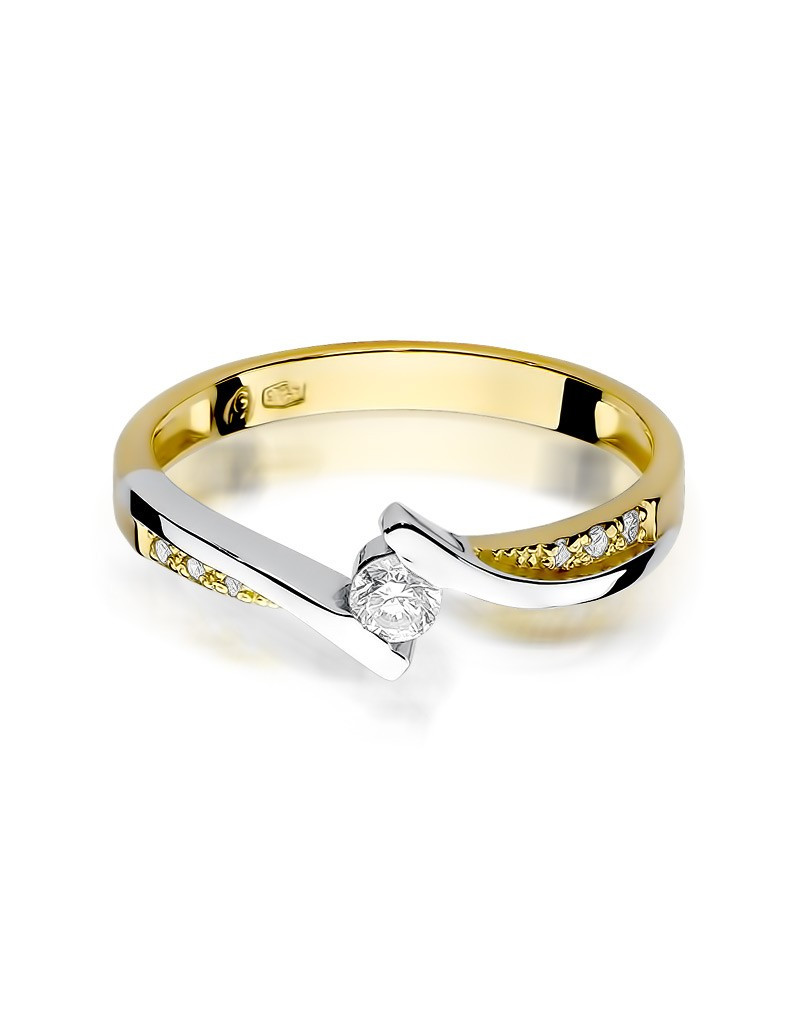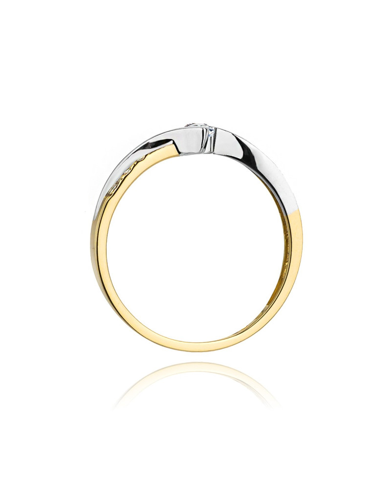 Niebanalny wzór złotego pierścionka z 7 brylantami w dwukolorowym złocie.