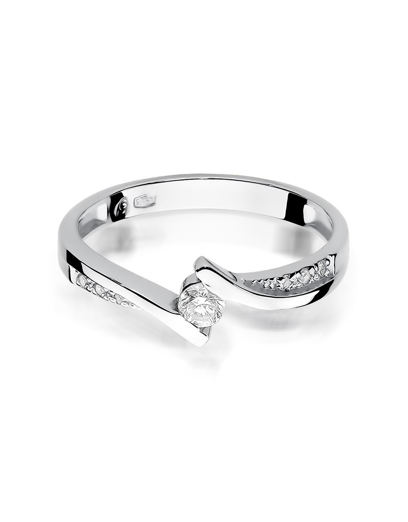 Niebanalny wzór złotego pierścionka z 7 brylantami, wykonany z białego złota.