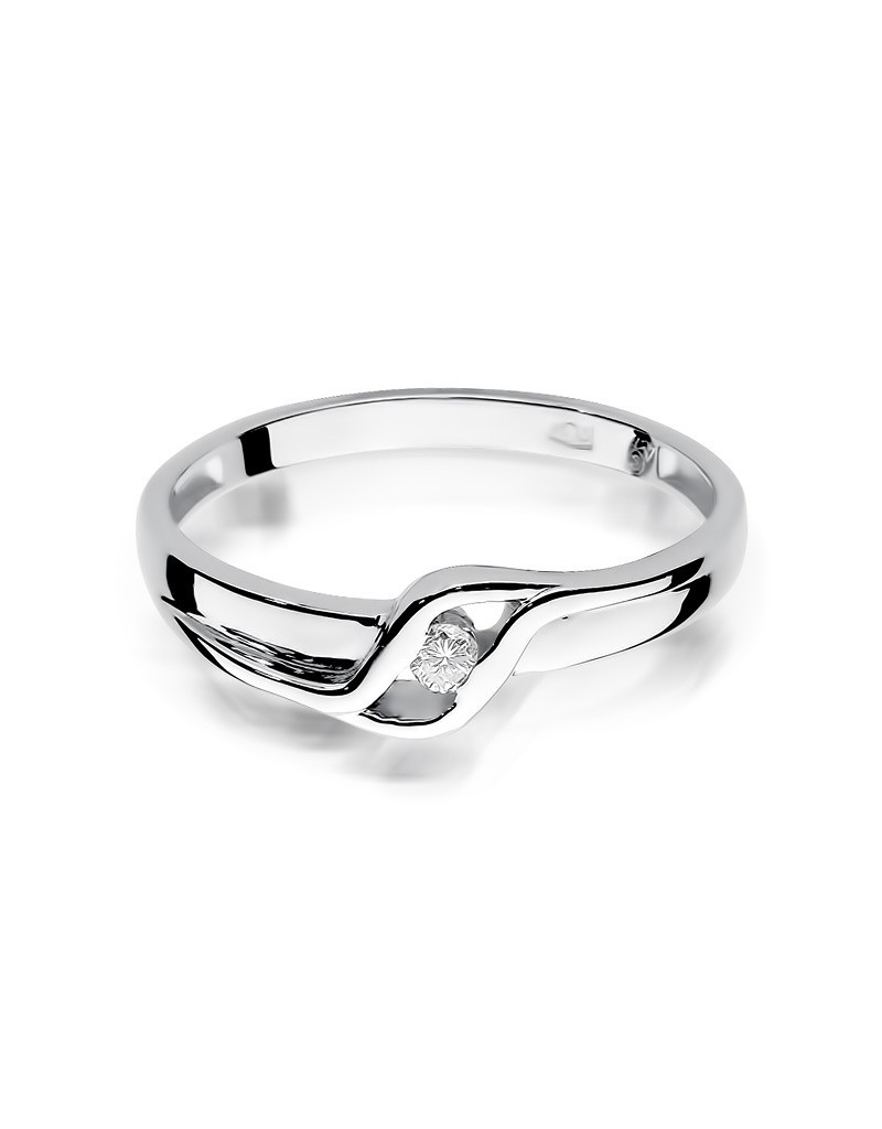 Urzekający pierścionek z białego złota z lśniącym brylantem osadzonym w niezwykłej fali.