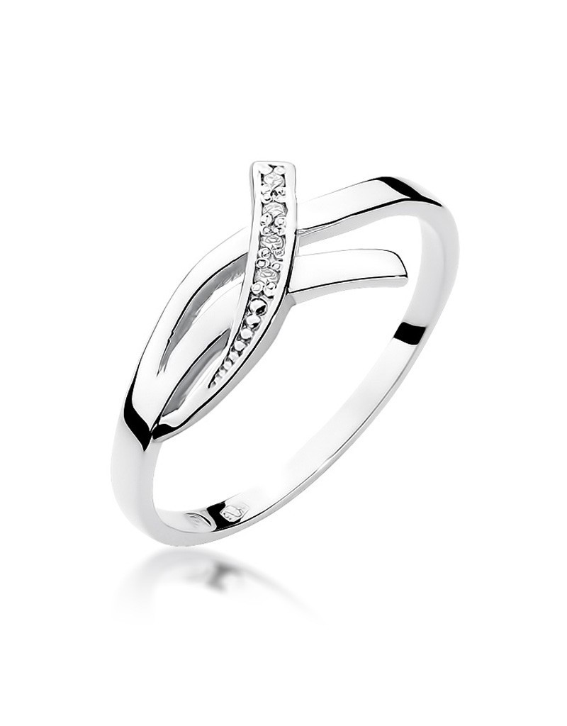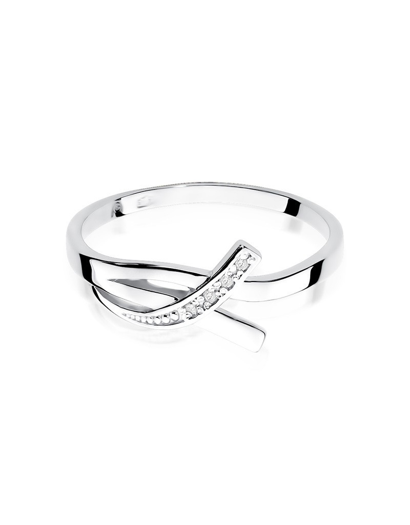 Fantazyjna forma pierścionka z białego złota z wygiętą szyną ozdobioną brylantami.