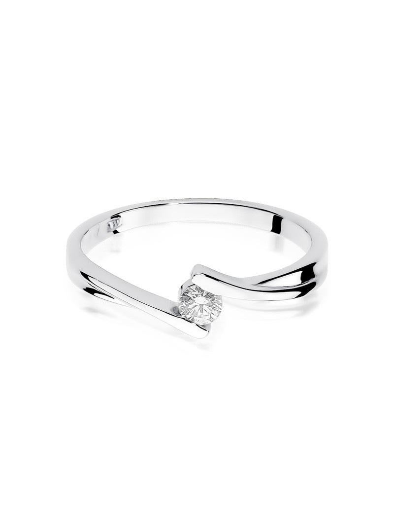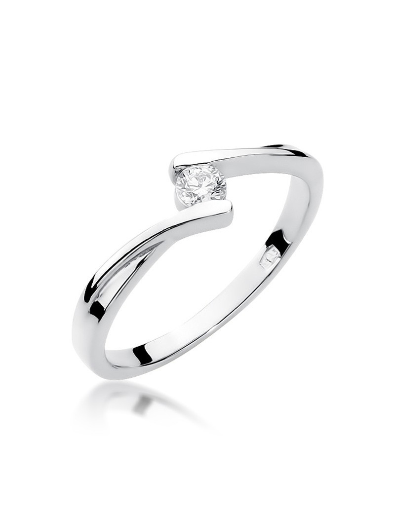 Romantyczny pierścionek z białego złota oraz lśniącym brylantem w nowoczesnej oprawie.