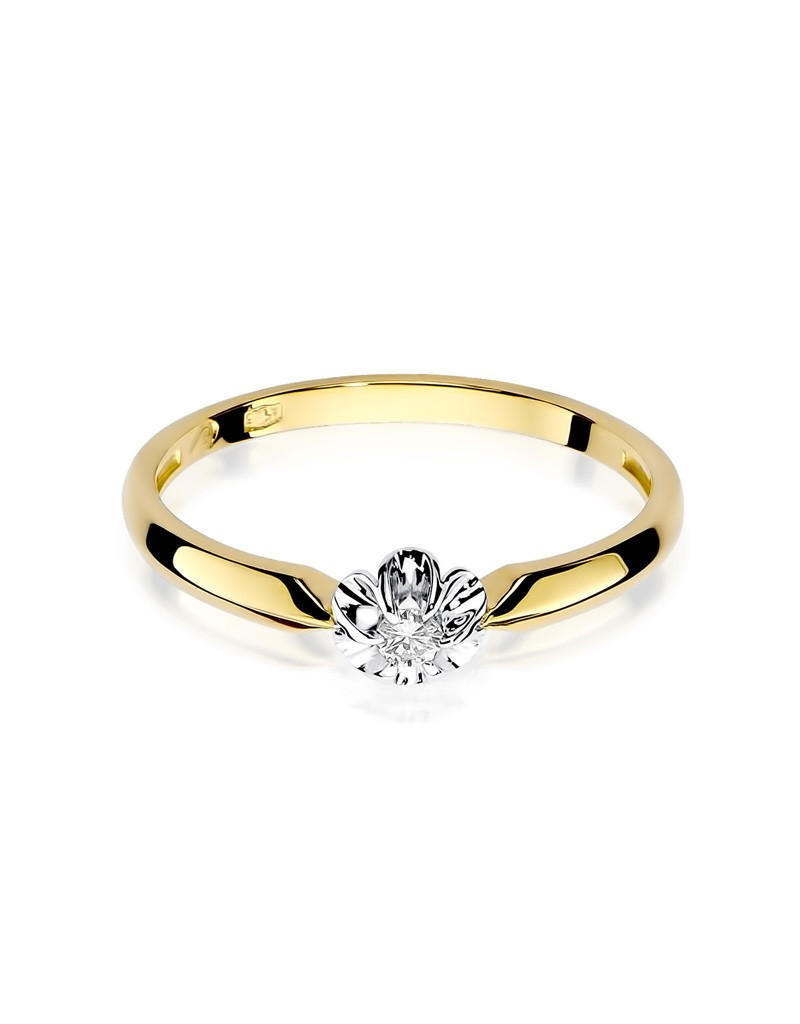 Romantyczny złoty pierścionek z olśniewającym brylantem i oprawą w kształcie kwiatuszka.