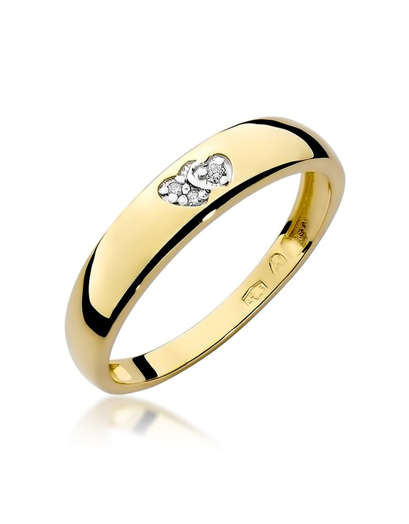 Prześliczny pierścionek z żółtego złota z lśniącymi brylantami osadzonymi w serduszkach.