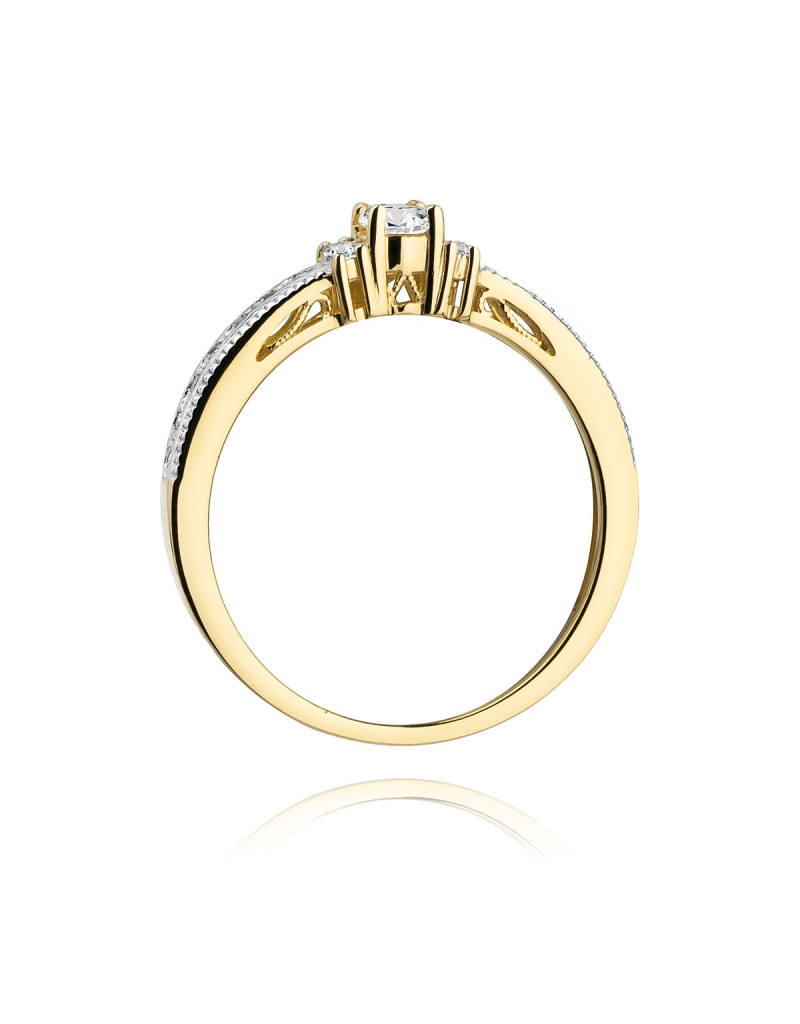 Elegancki złoty pierścionek z pełnymi blasku brylantami, które dodają mu lśnienia.