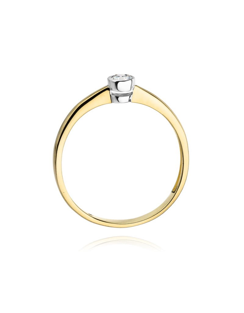 Subtelny pierścionek z żółtego złota z lśniącym brylantem w delikatnym kręgu z białego złota.