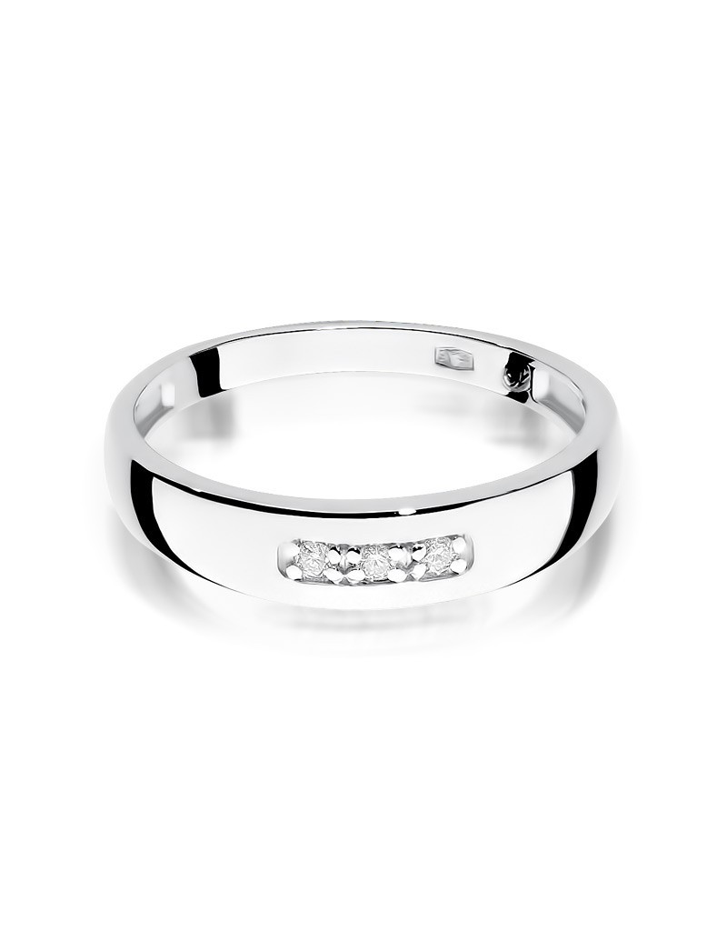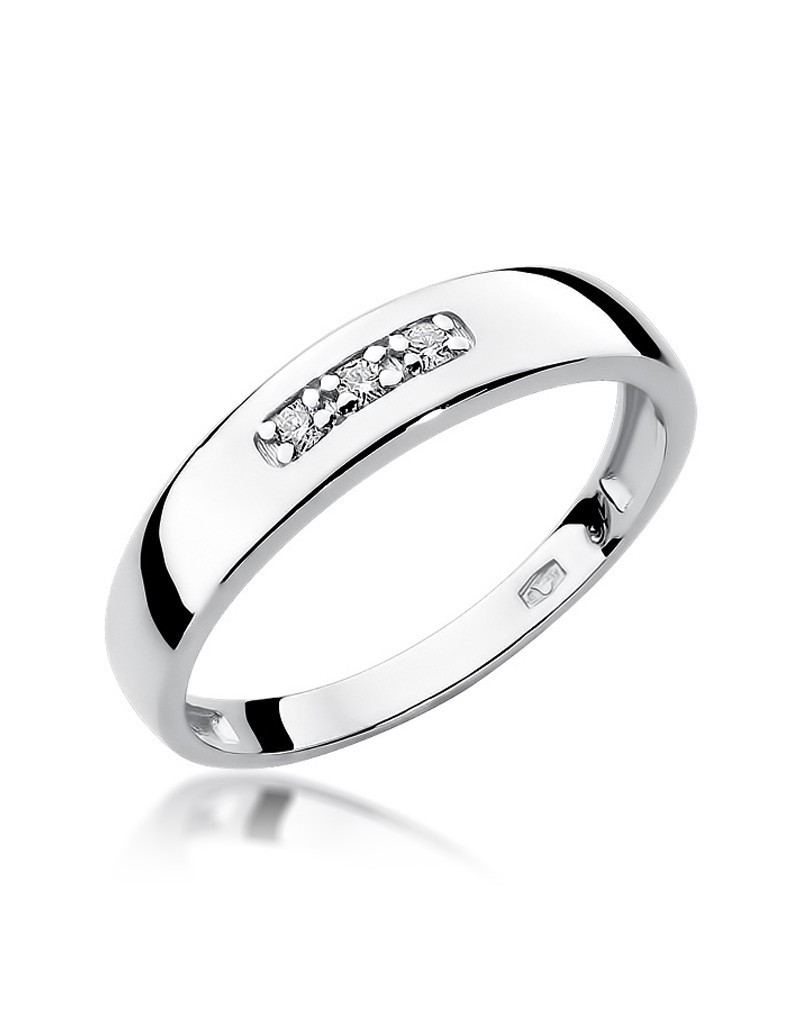 Nowoczesny pierścionek z białego złota z 3 błyszczącymi brylantami w formie obrączki.