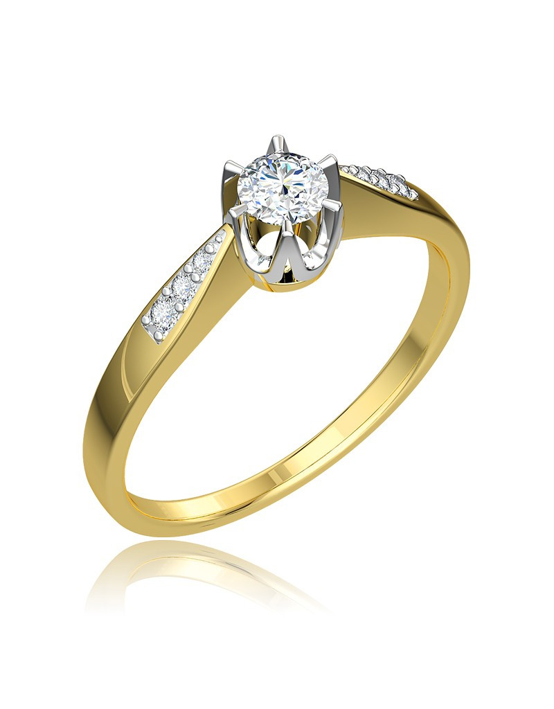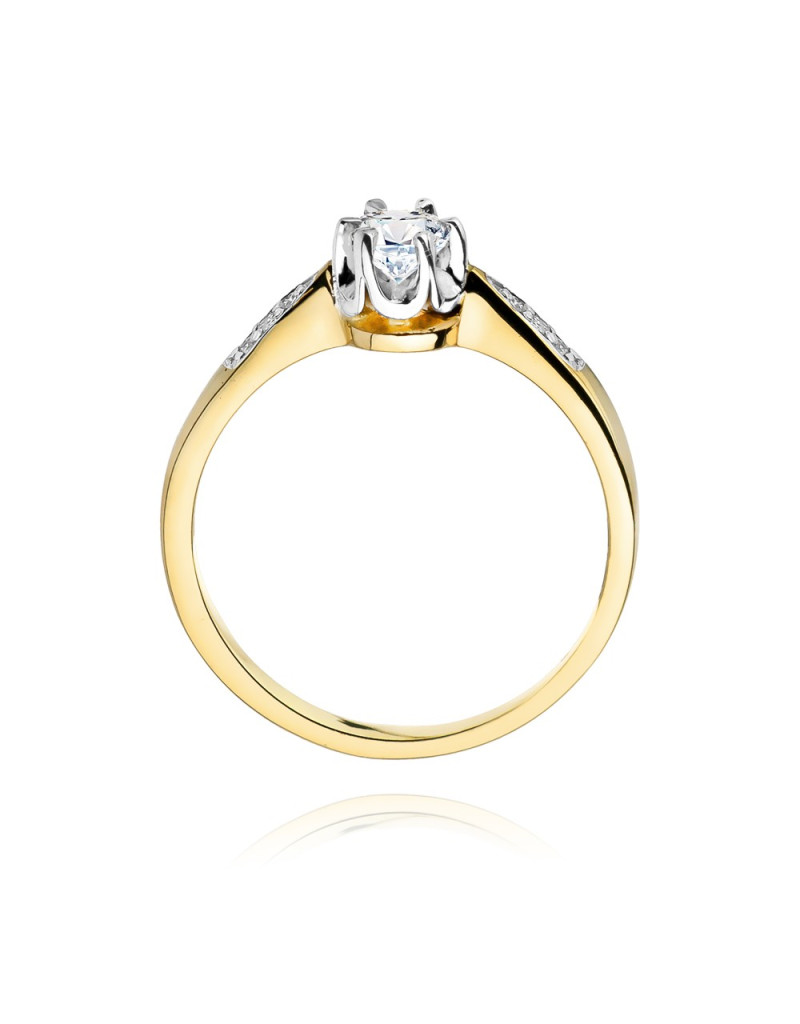 Unikatowy pierścionek wykonany z żółtego złota z niezwykłym brylantem w sześcioramiennej koronie z białego złota, oraz szyną ozdobioną brylantami.
