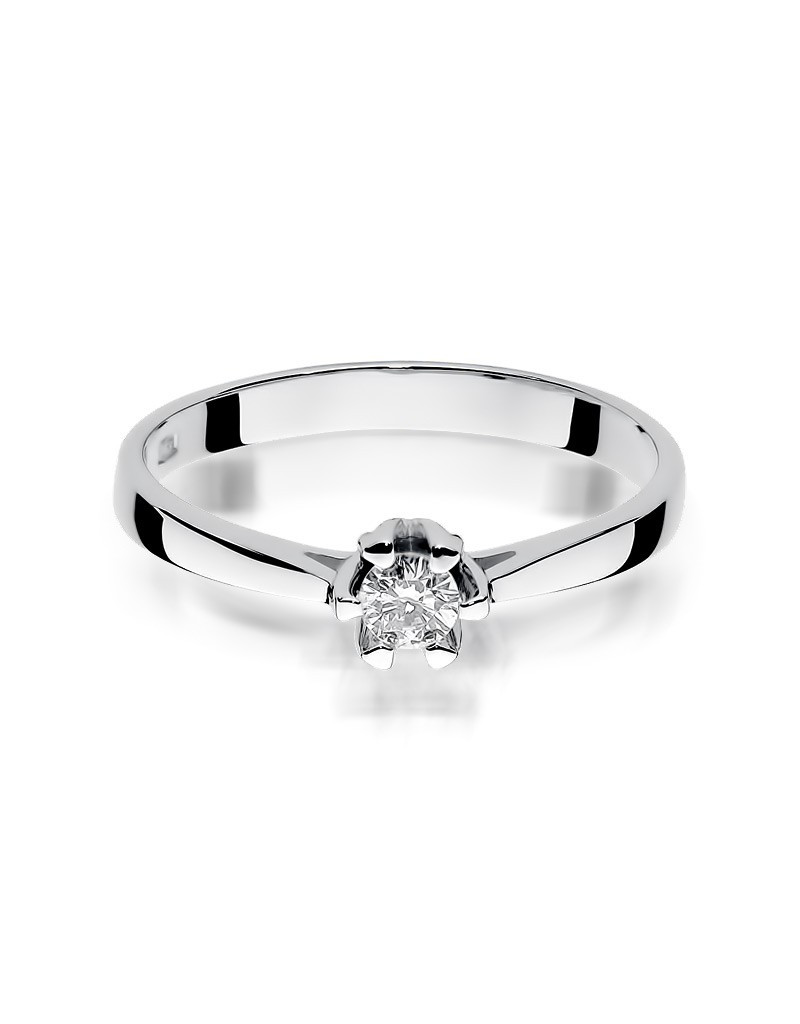 Gustowny i elegancki pierścionek z białego złota z pełnym blasku brylantem w sześcioramiennej koronie.
