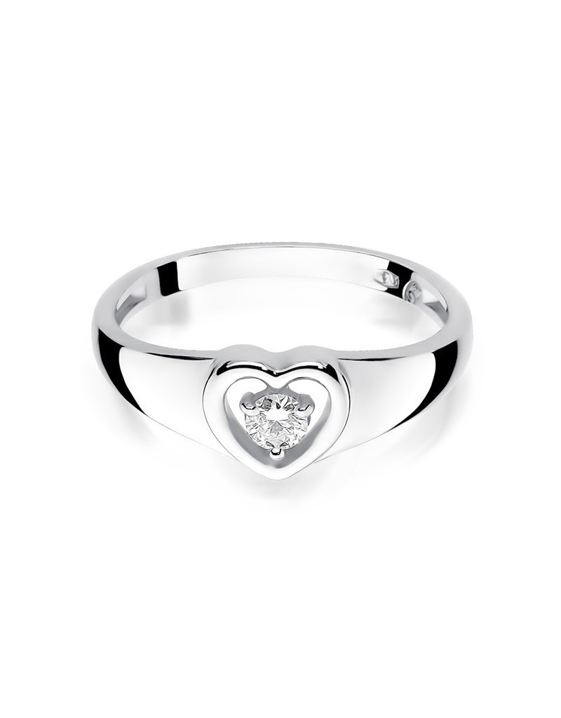Pierścionek z białego złota w przepięknej oprawie w kształcie serca z brylantem w środku.