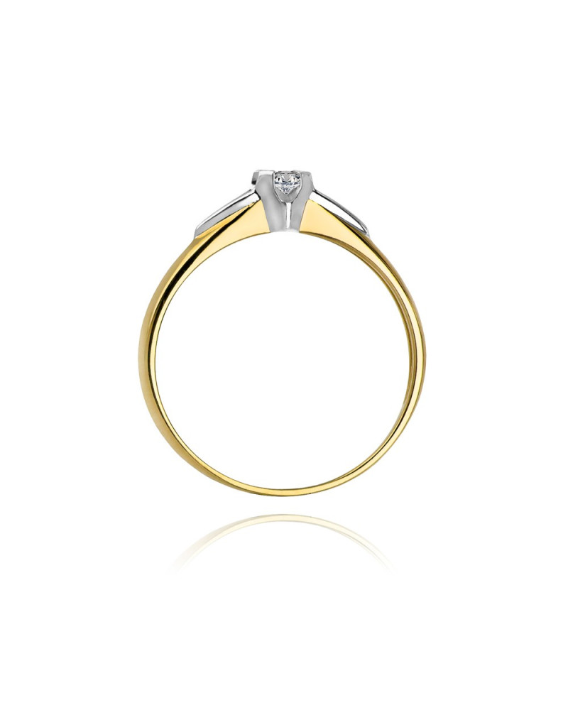 Nietuzinkowy pierścionek z żółtego złota z brylantem w nowoczesnej oprawie podkreślony białym złotem.