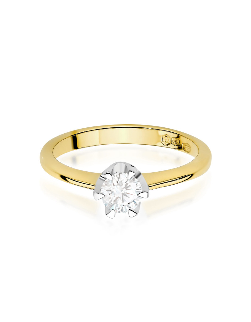 Luksusowy pierścionek wykonany z żółtego złota z przepięknym brylantem w sześcioramiennej koronie z białego złota, pełnej blasku i lśnienia.