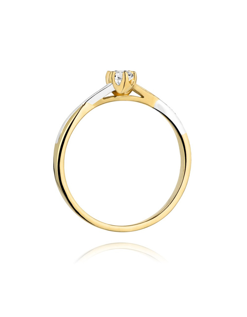 Zjawiskowy złoty pierścionek z urokliwym brylantem w sześcioramiennej koronie w falowanej szynie w dwóch kolorach.