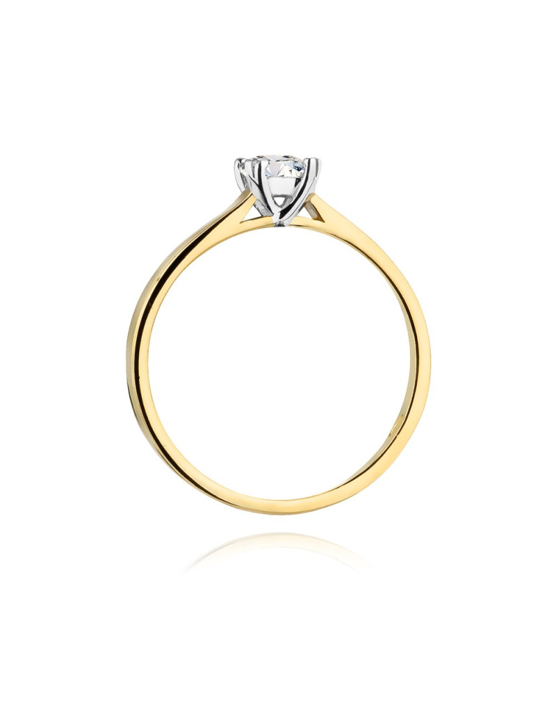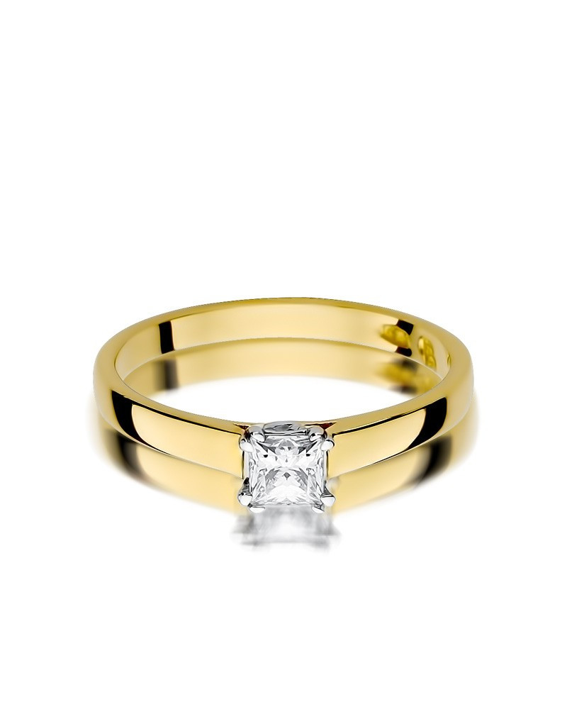Gustowny i elegancki złoty pierścionek z kwadratowym brylantem w czteroramiennej koronie.