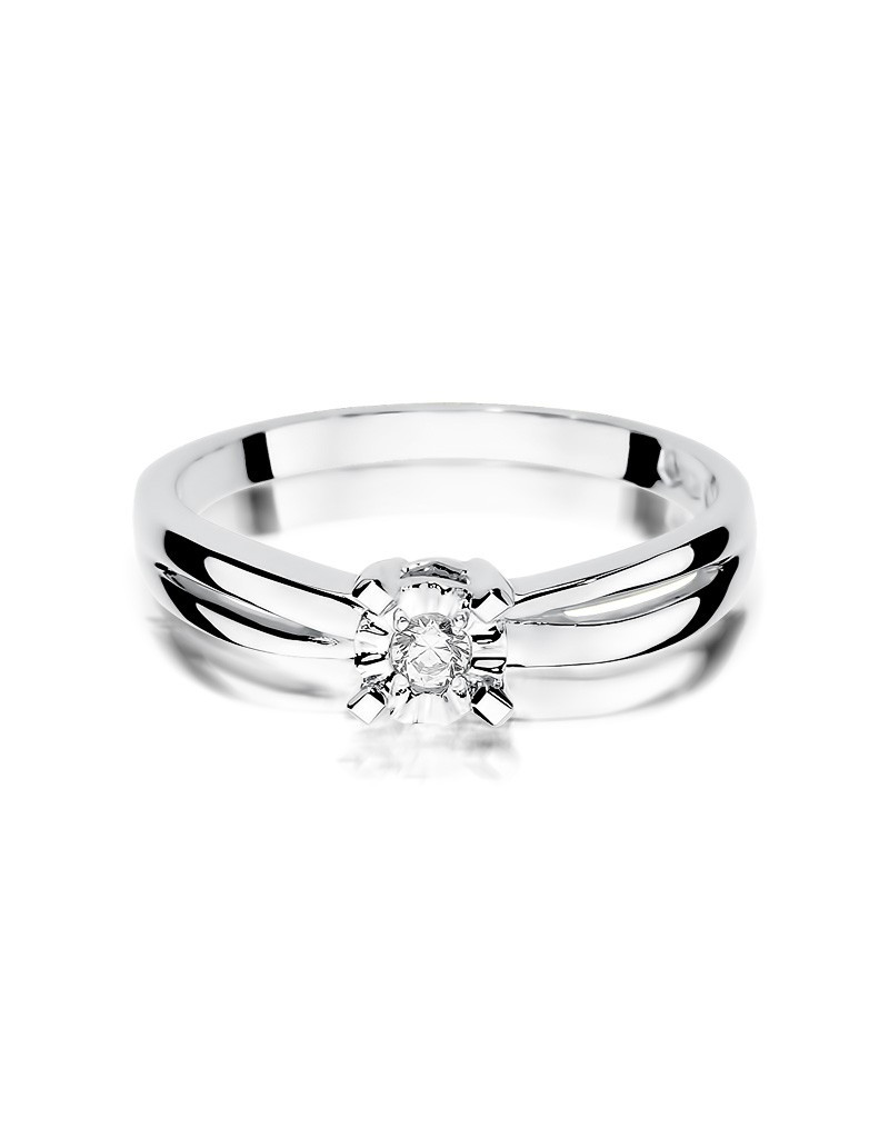 Zmysłowy pierścionek z olśniewającym brylantem w delikatnym kręgu z białego złota w eleganckiej oprawie.