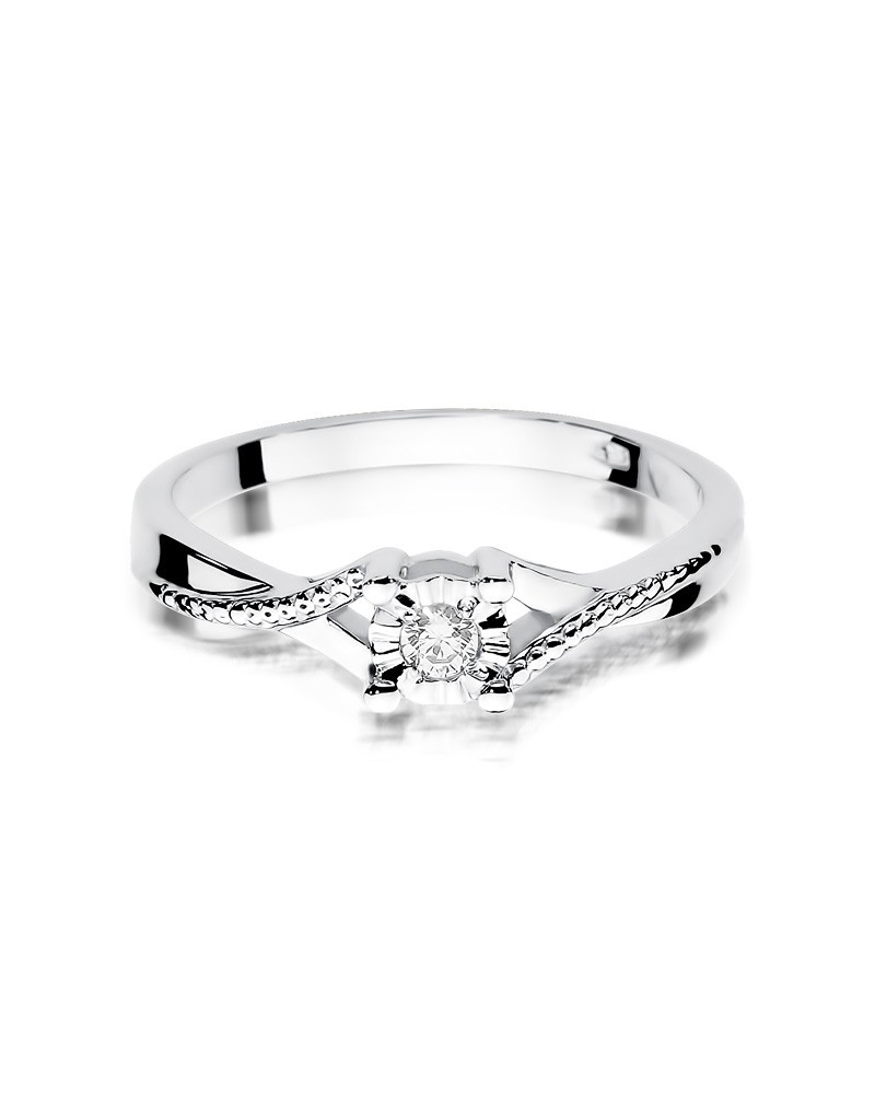 Uwodzicielski pierścionek z olśniewającym brylantem w delikatnym kręgu na subtelnie ozdobionej szynie.