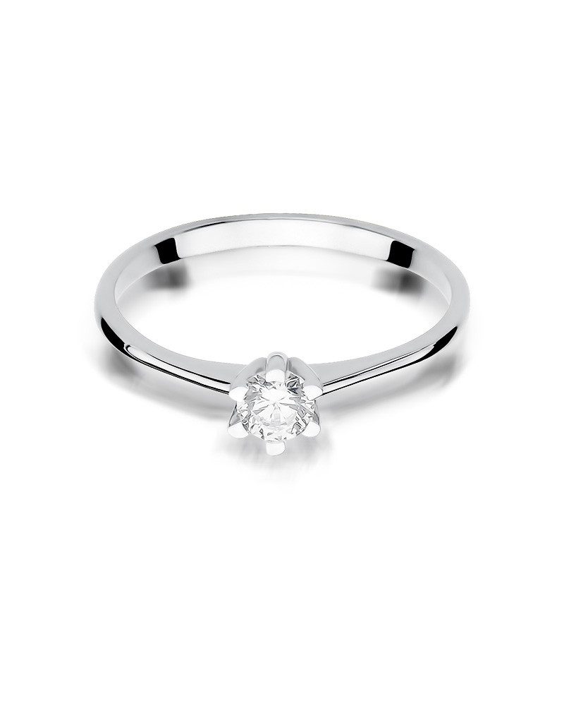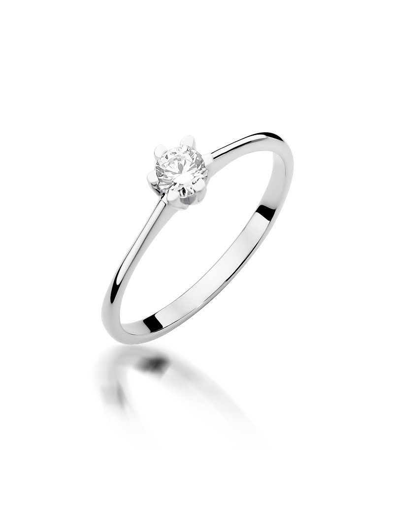 Klasyczna forma pierścionka z białego złota z brylantem w sześcioramiennej koronie w eleganckiej oprawie.