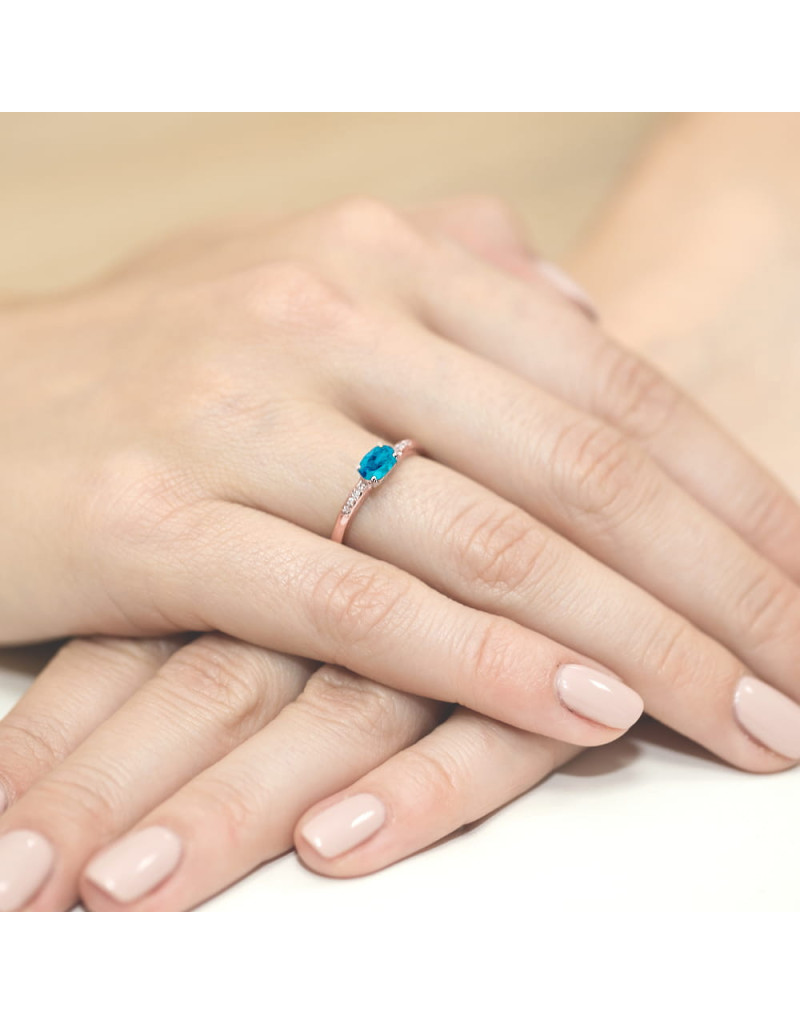 Wyjątkowy złoty pierścionek z ciemnobłękitnym Topazem London Blue oraz lśniącymi brylantami w eleganckiej oprawie.