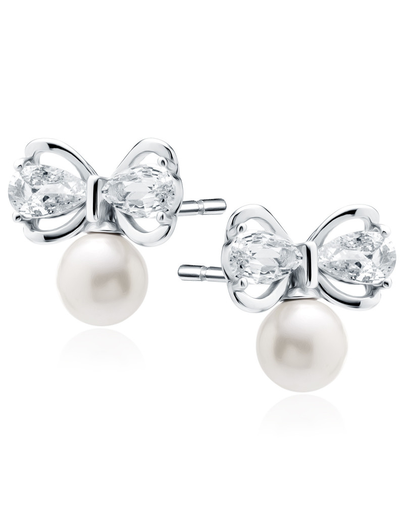 Srebrne kolczyki pr.925 z perłą i kokardkami i białą cyrkonią