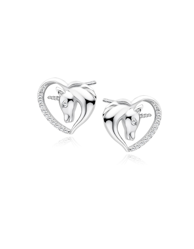 Srebrne kolczyki serca - jednorożec z białymi cyrkoniami pr.925