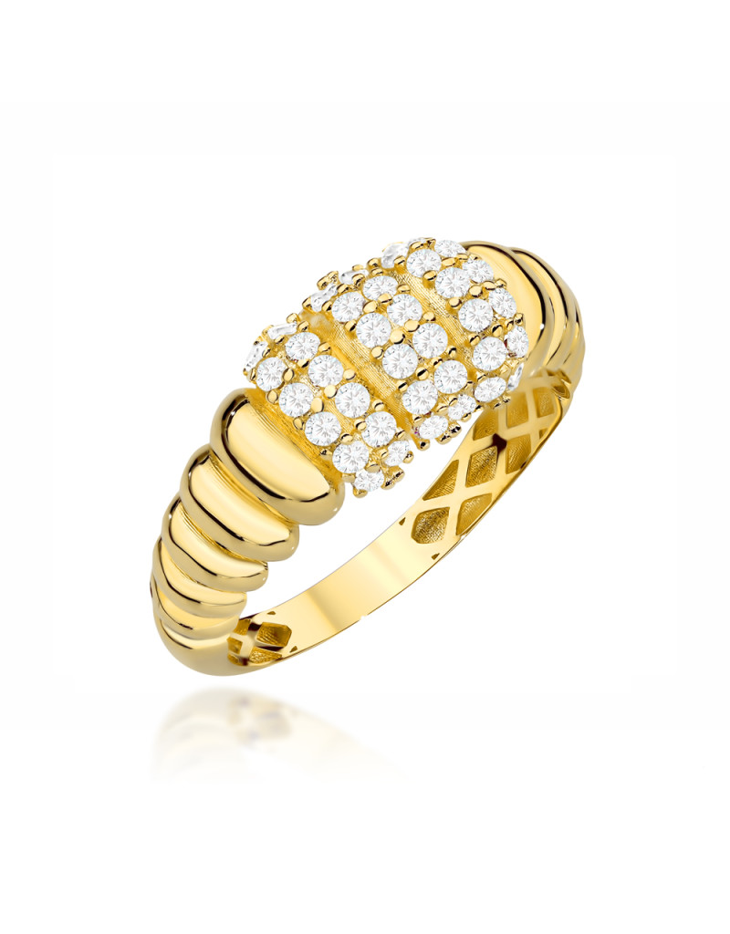 Pierścionek złoty żłobiony z potrójnym rzędem wysadzanym cyrkoniami (Rozmiar pr. 585: 17 Gramatura: 2.13)