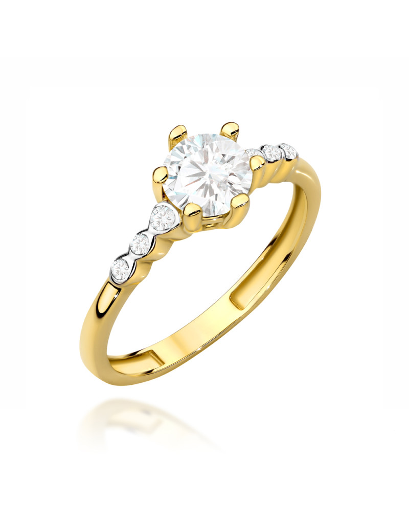 Pierścionek złoty z centralną cyrkonią i mniejszymi po bokach (Rozmiar pr. 585: 19 Gramatura: 2.12)