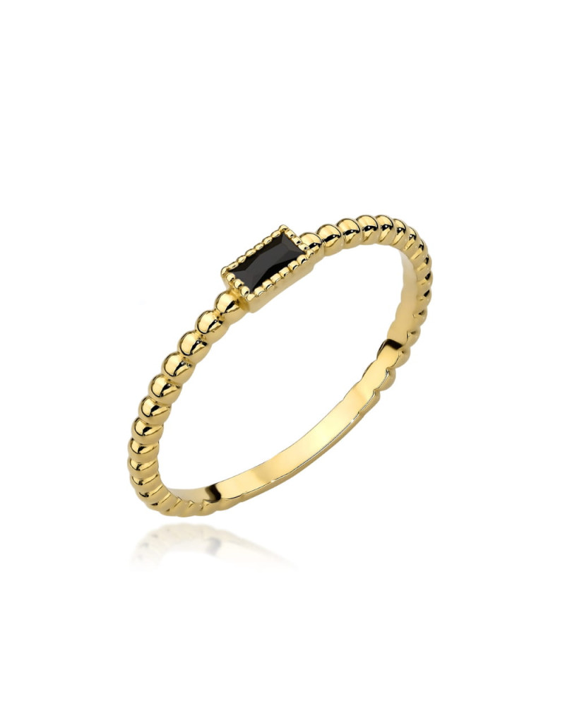 Pierścionek złoty kuleczki i prostokąt z czarnym kamieniem to elegancki dodatek, który zachwyci każdego miłośnika biżuterii. Wykonany z wysokiej jakości złota próby 585, ten pierścionek łączy w sobie nowoczesny design z klasycznym stylem.