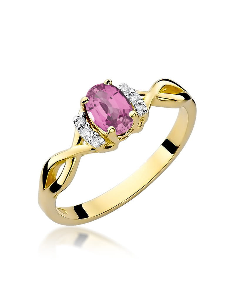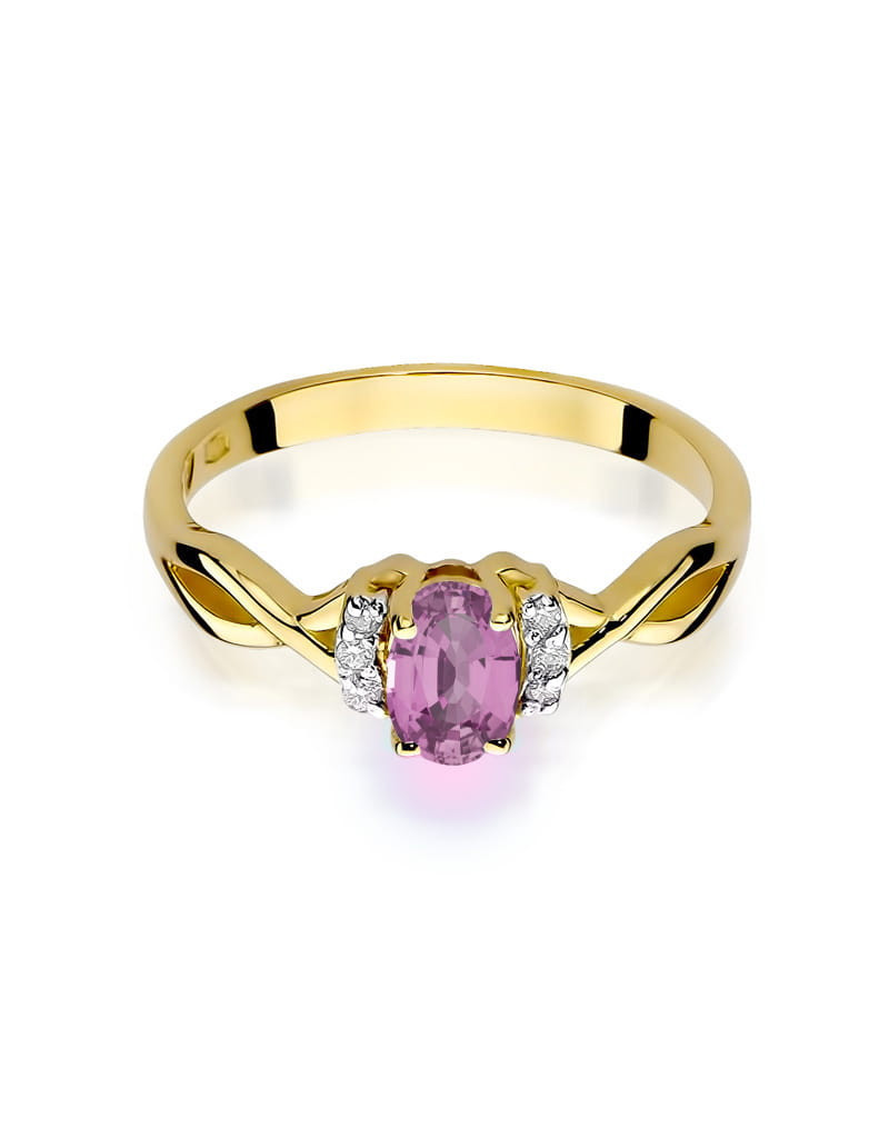 Urzekający wzór pierścionka z żółtego złota z czarującym różowym szafirem i 6 brylantami.