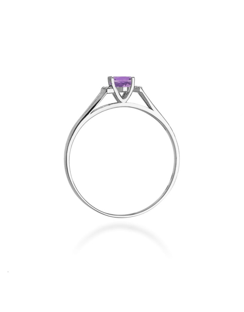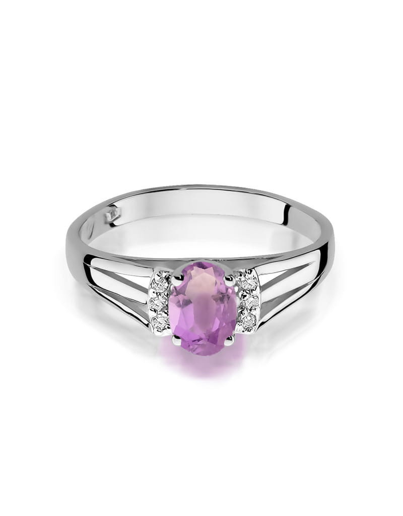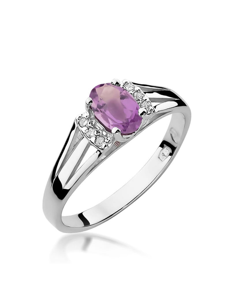 Doskonały wzór pierścionka z sześcioma brylantami, oraz niezwykłym owalnym ametystem. Wykonany z białego złota.