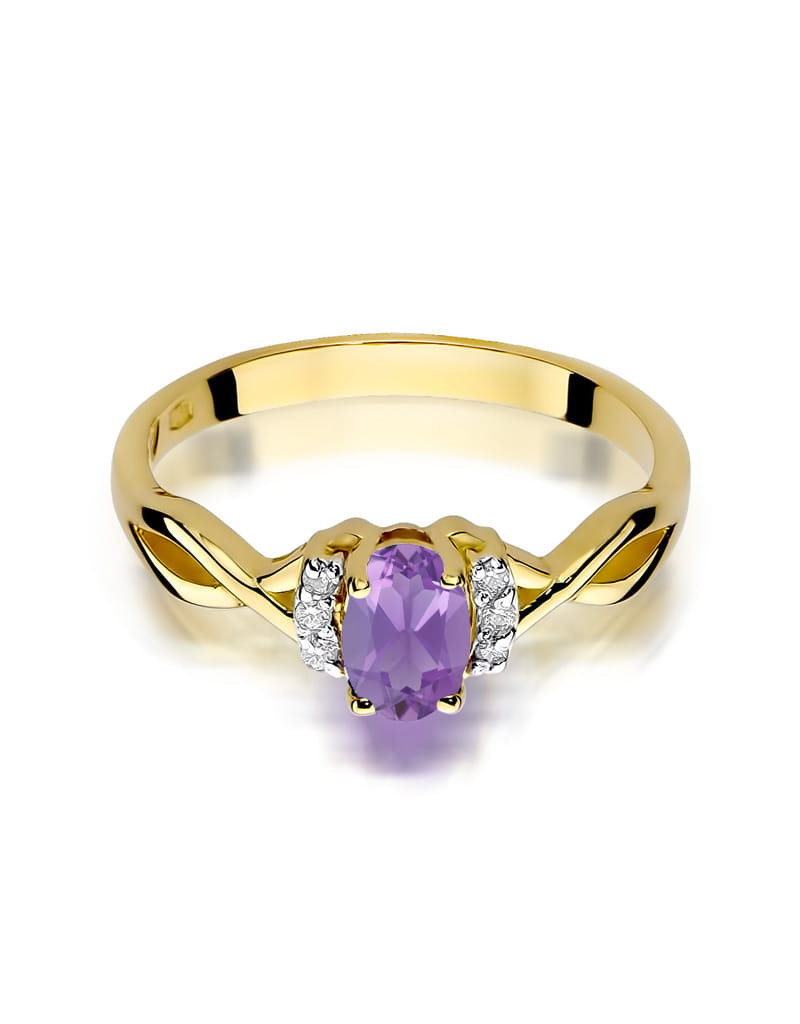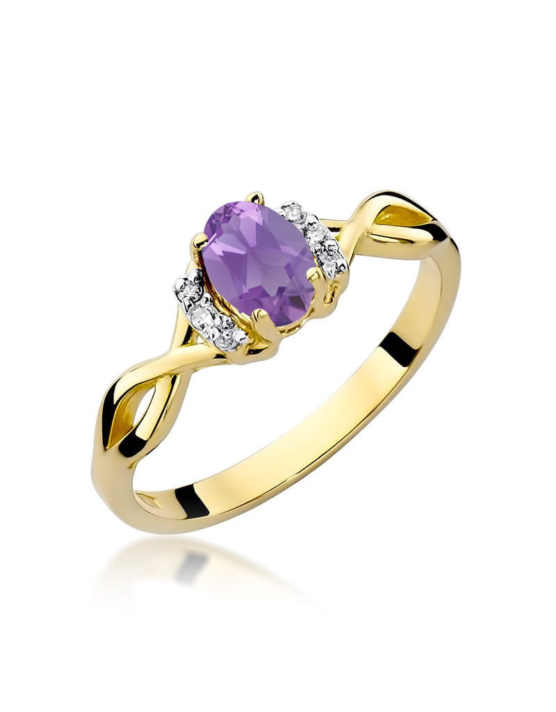 Urzekający wzór pierścionka z żółtego złota z czarującym ametystem i 6 brylantami.