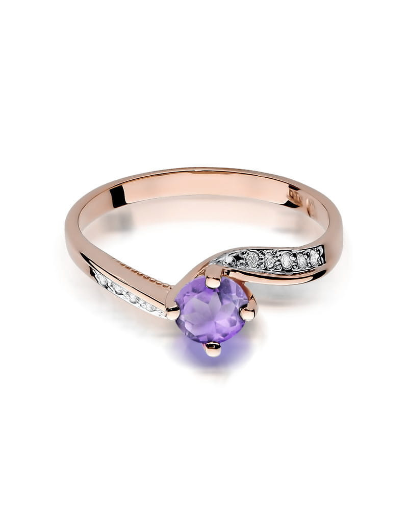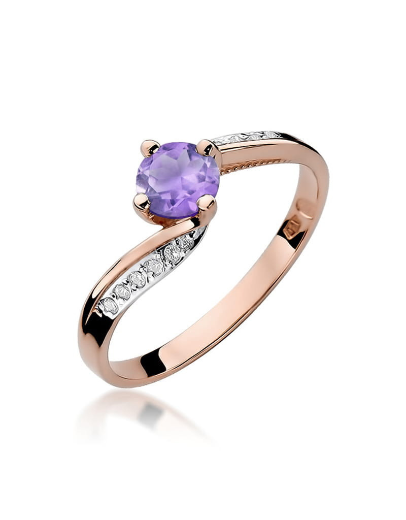 Pełen wdzięku pierścionek z różowego złota z urokliwym ametystem i brylantami w osadzonymi w białym złocie w romantycznej oprawie.