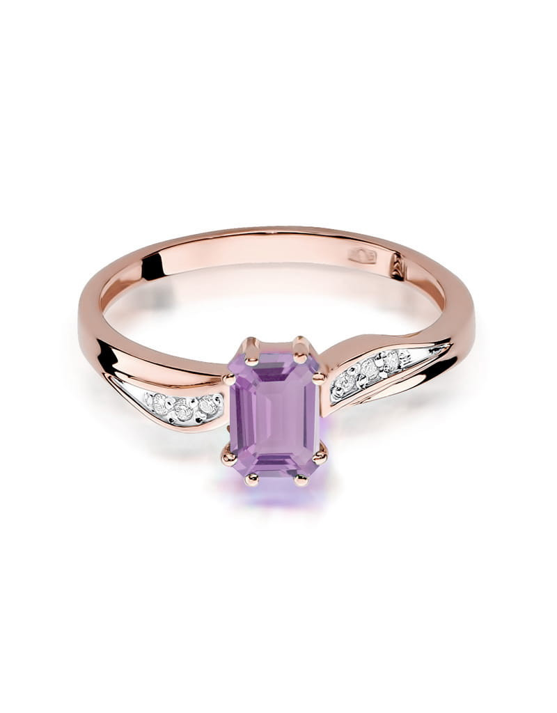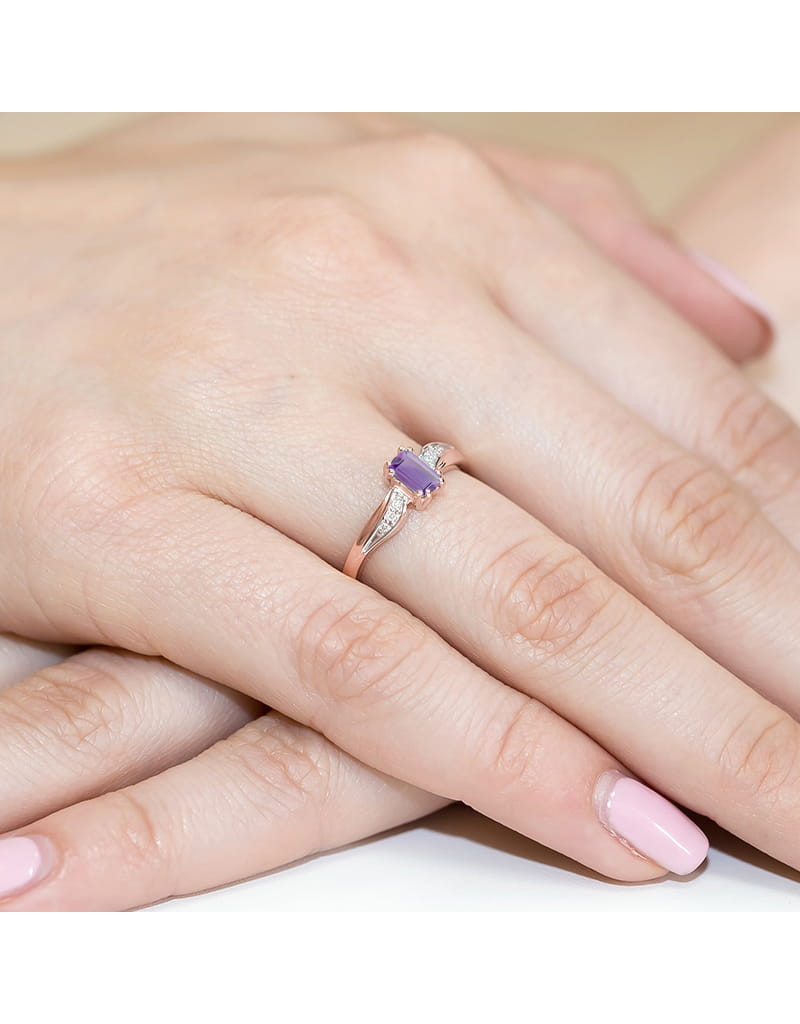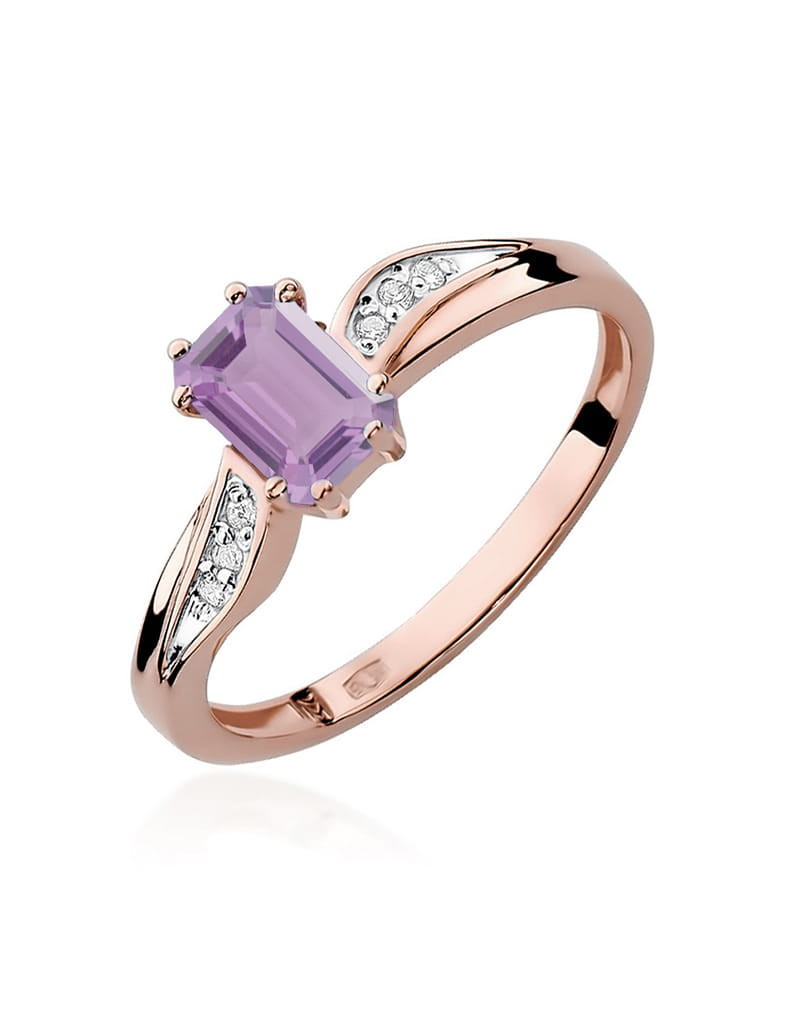 Stylowy pierścionek z różowego złota z unikatowym ametystem w szlifie szmaragdowym, oraz brylantami w eleganckiej oprawie.