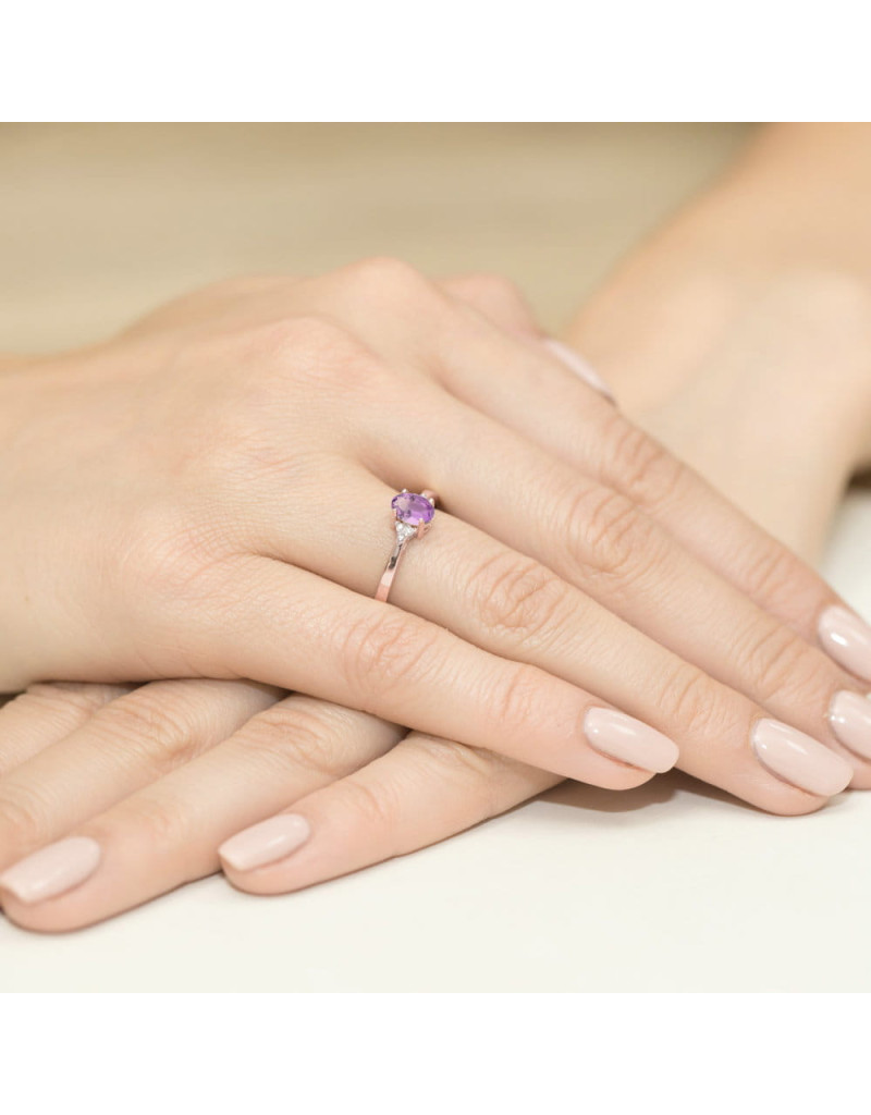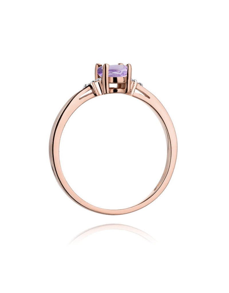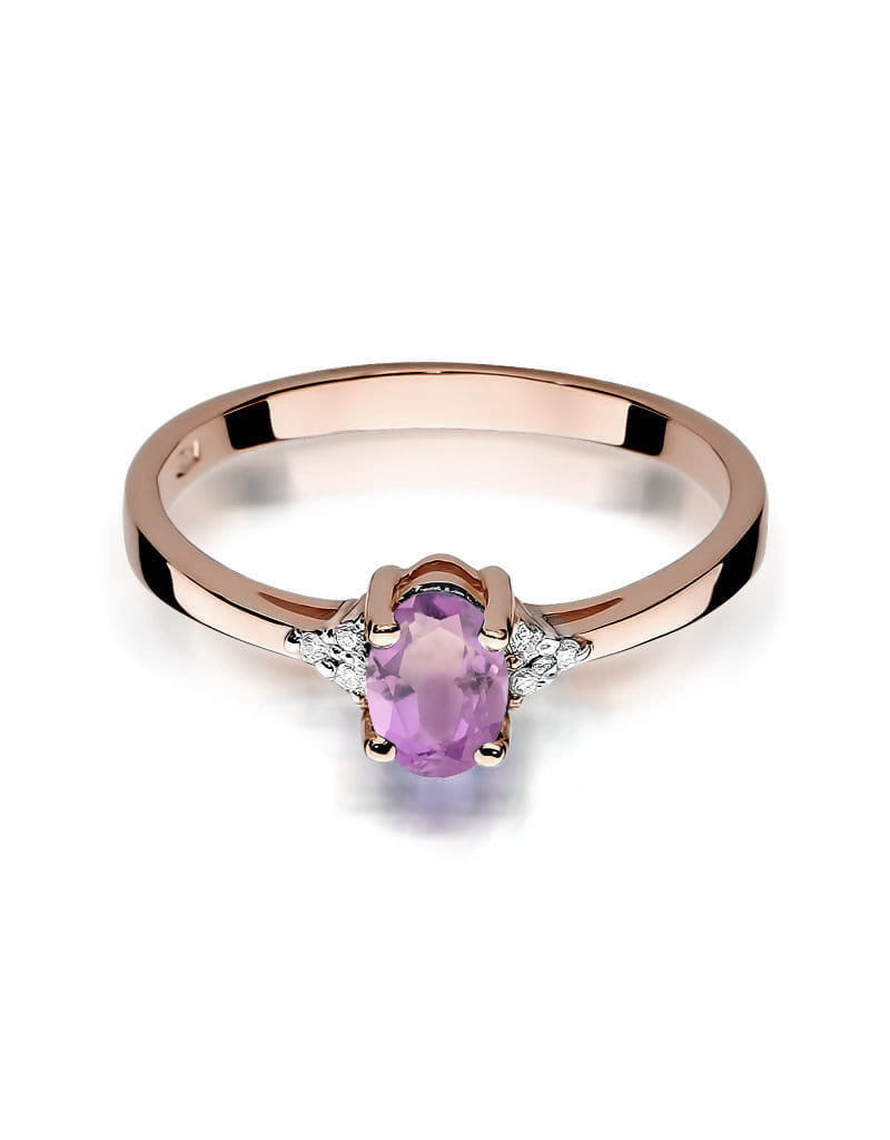 Urzekający pierścionek wykonany z różowego złota z przepięknym ametystem, oraz brylantami które dodają mu blasku.