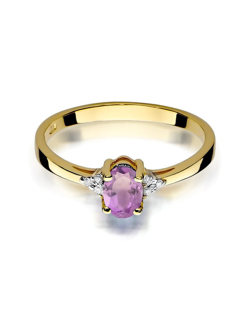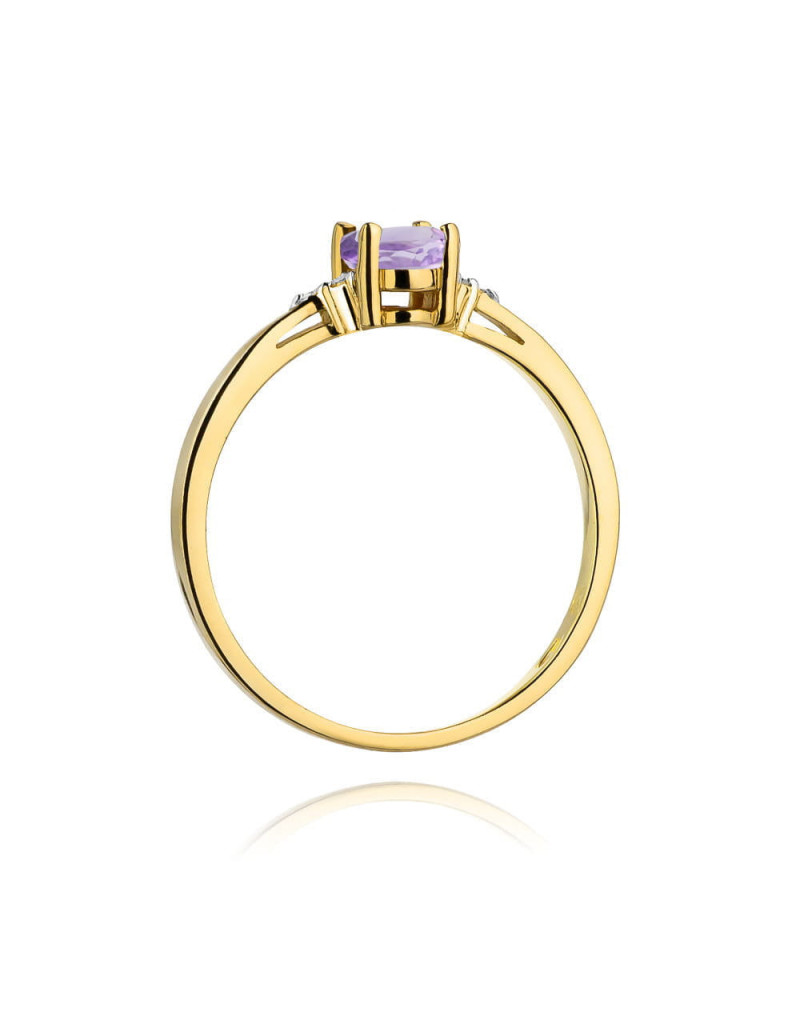 Urzekający pierścionek wykonany z żółtego złota z przepięknym fioletowym ametystem, oraz brylantami które dodają mu blasku.