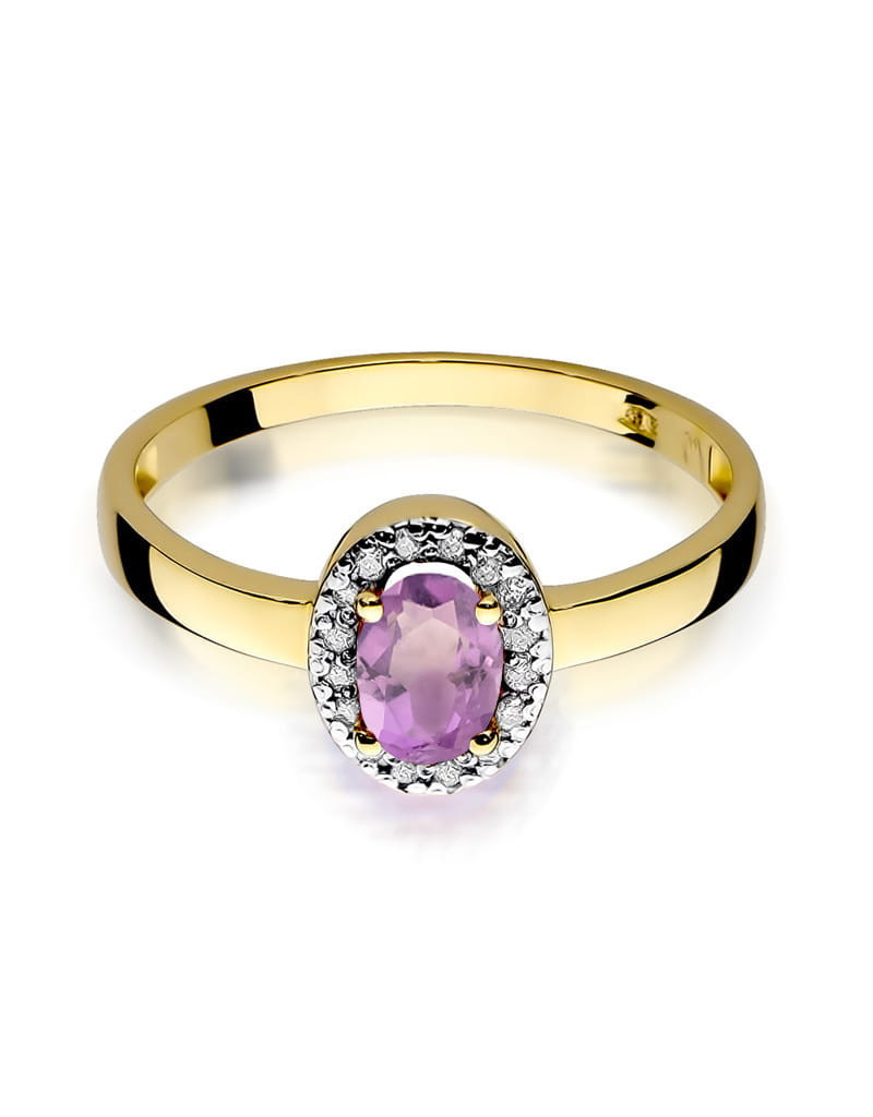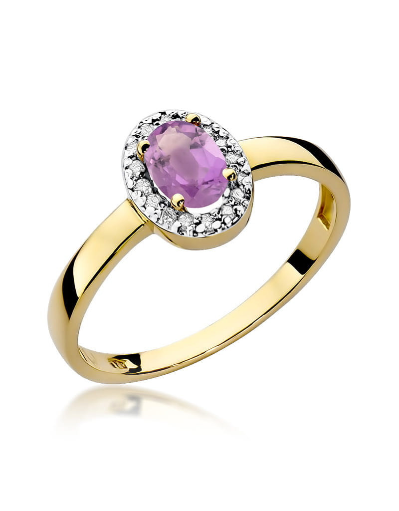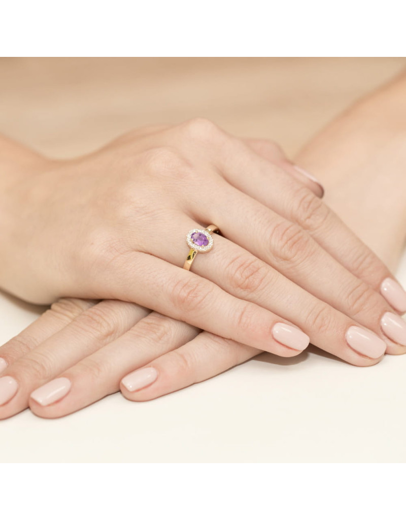 Pełen wdzięku pierścionek z żółtego złota z unikatowym ametystem ozdobionym brylantami w romantycznej oprawie.
