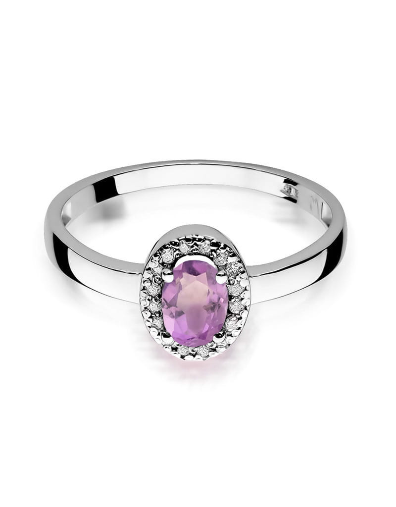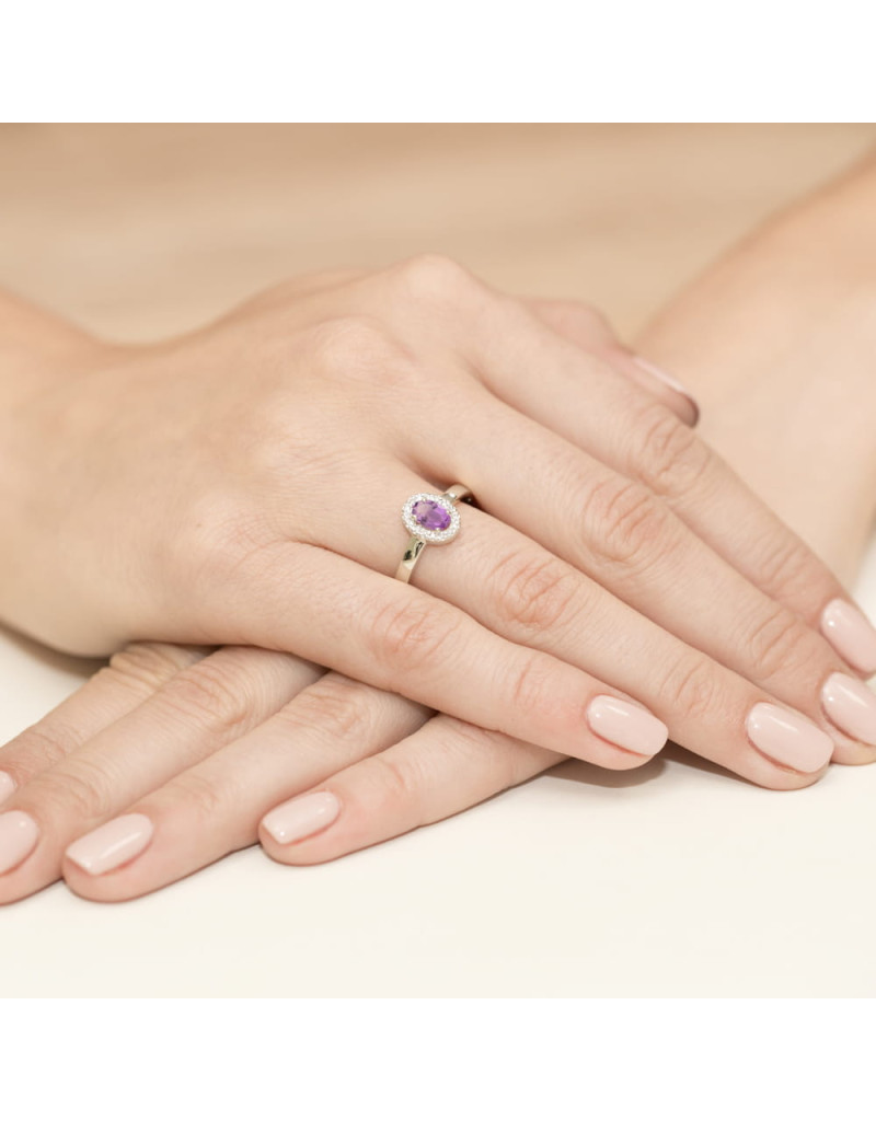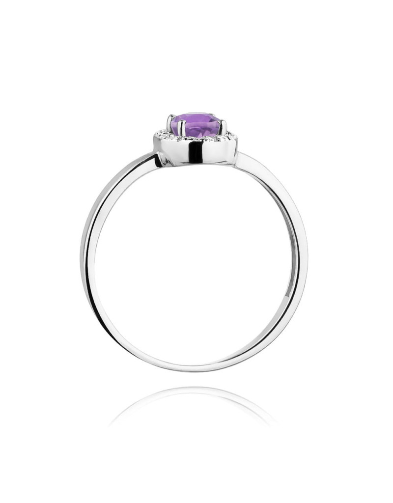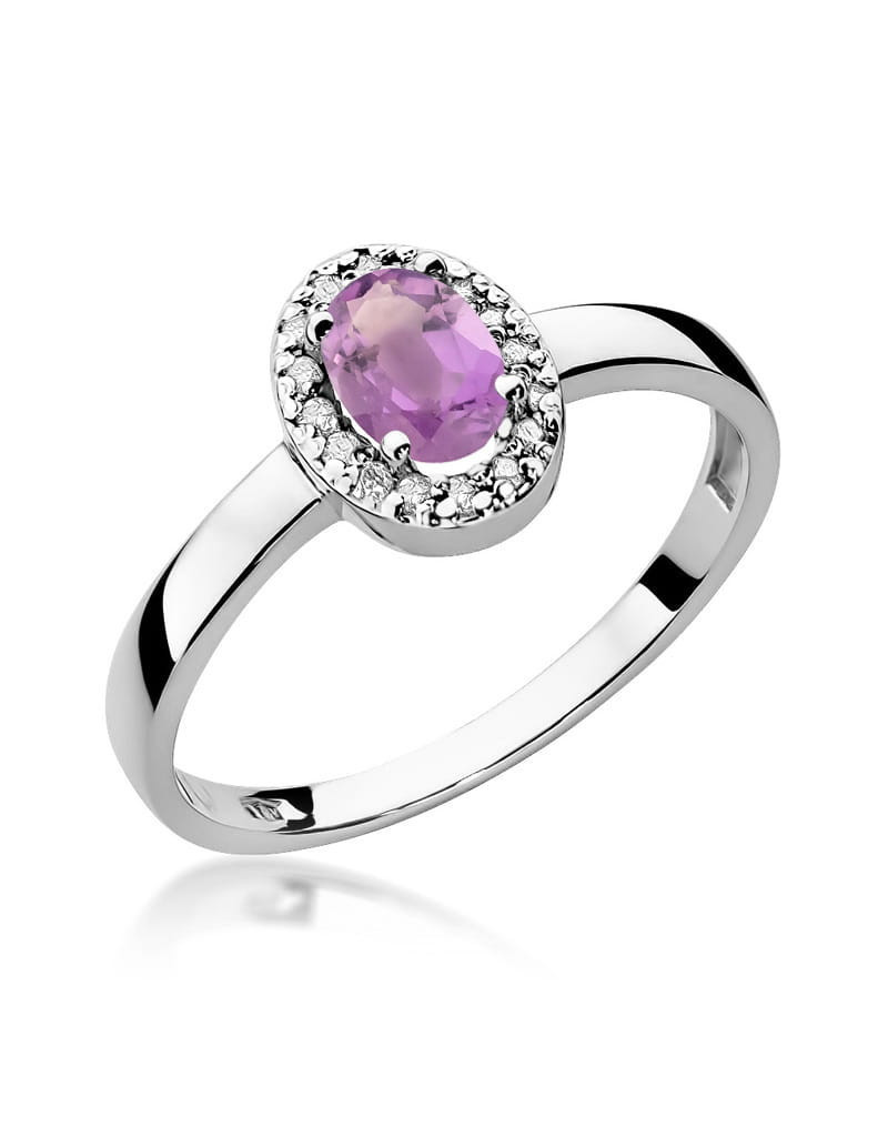 Pełen wdzięku pierścionek z białego złota z unikatowym ametystem ozdobionym brylantami w romantycznej oprawie.