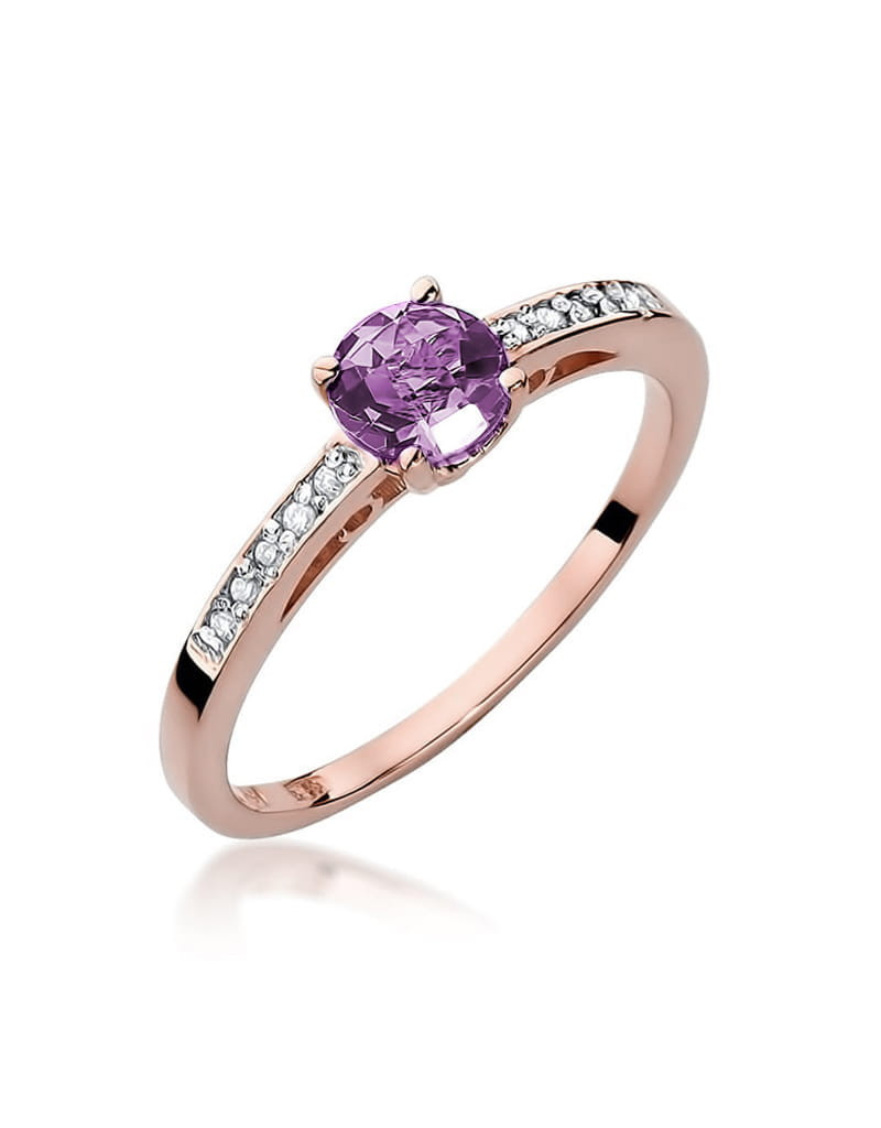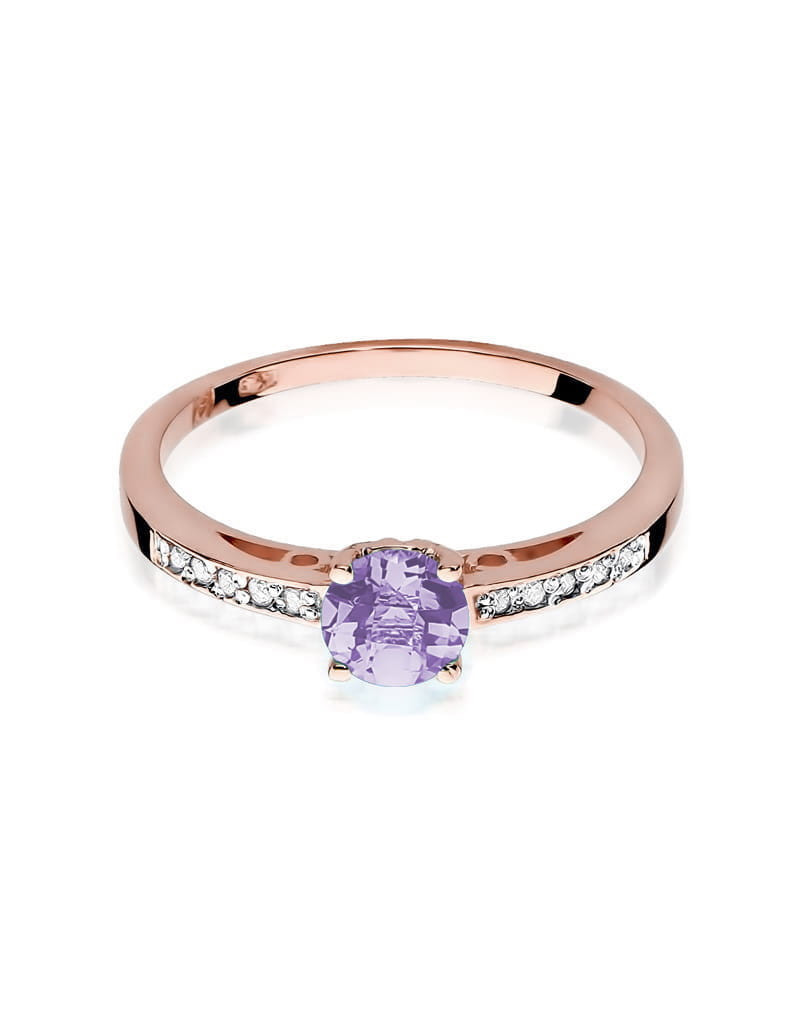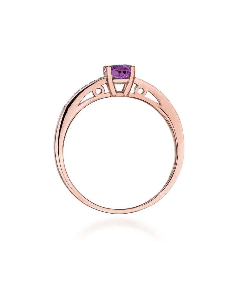 Uroczy pierścionek z różowego złota z okrągłym ametystem w czteroramiennej koronie oraz lśniącymi brylantami.