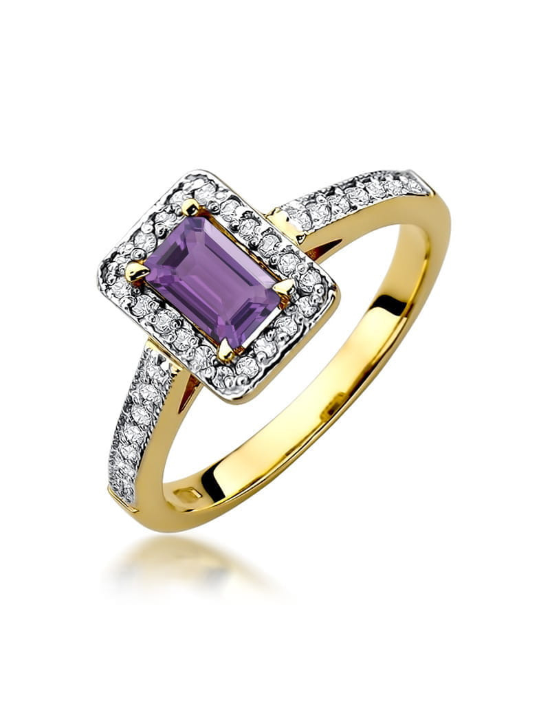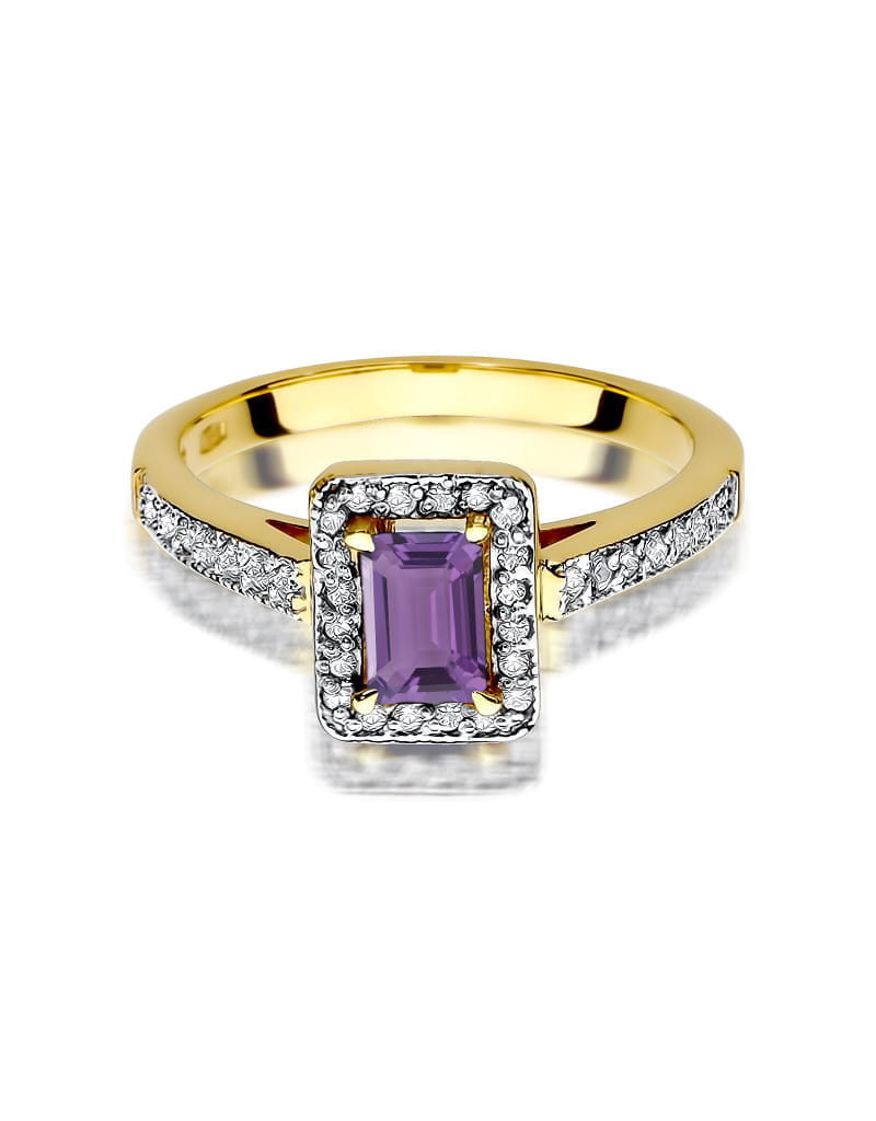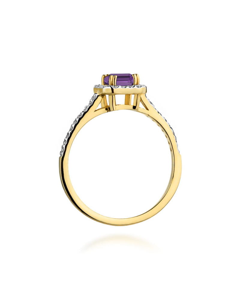 Pierścionek z ametystem i brylantami w żółtym złocie, niepowtarzalny wzór, idealnie pasuje na delikatną kobiecą dłoń. Model idealnie łączący tradycje i nowoczesność.