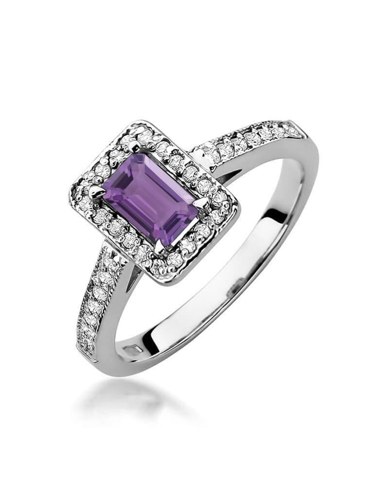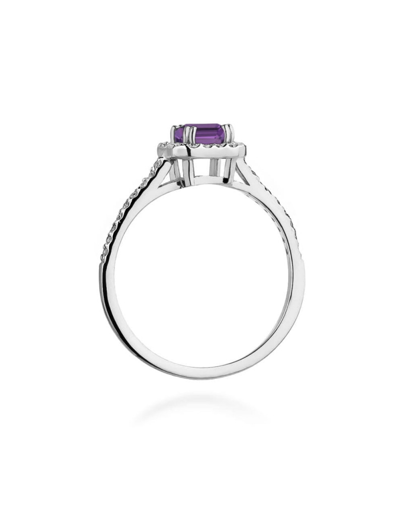 Pierścionek z ametystem i brylantami w białym złocie, niepowtarzalny wzór, idealnie pasuje na delikatną kobiecą dłoń. Model idealnie łączący tradycje i nowoczesność.