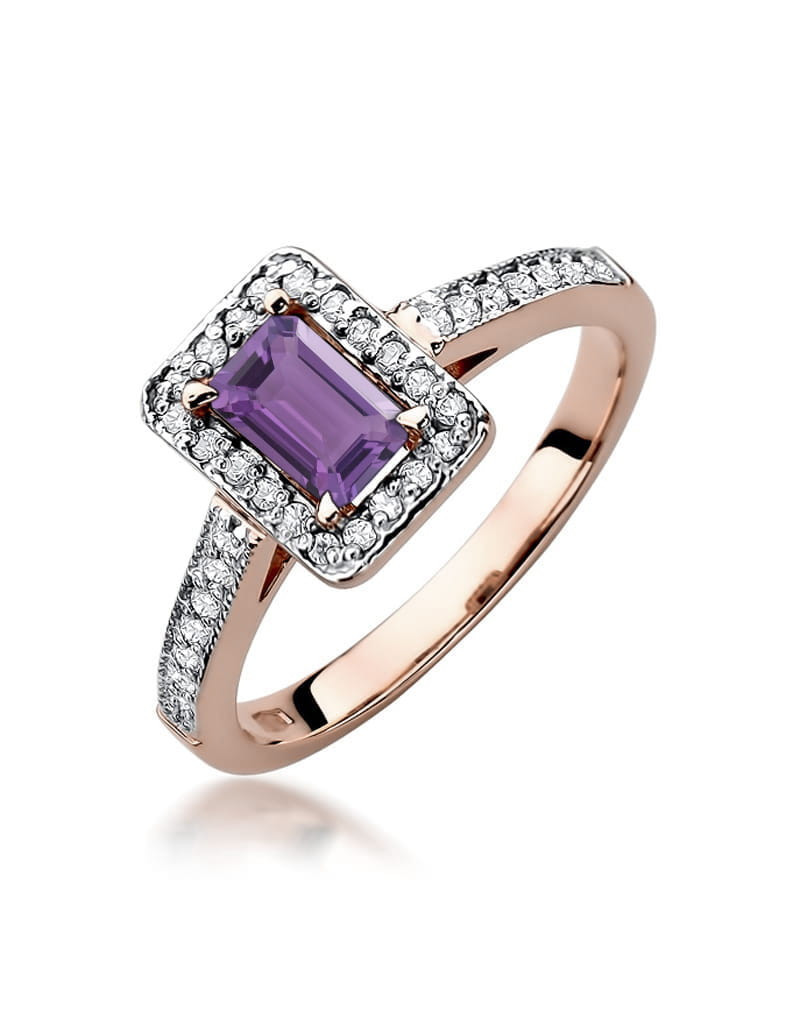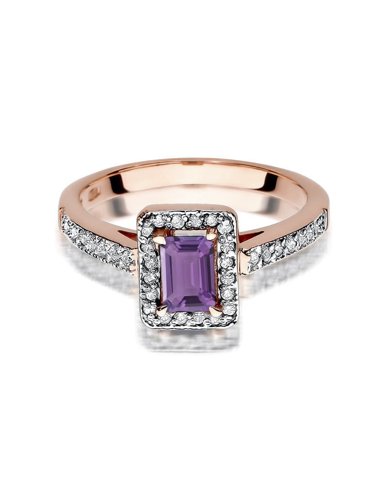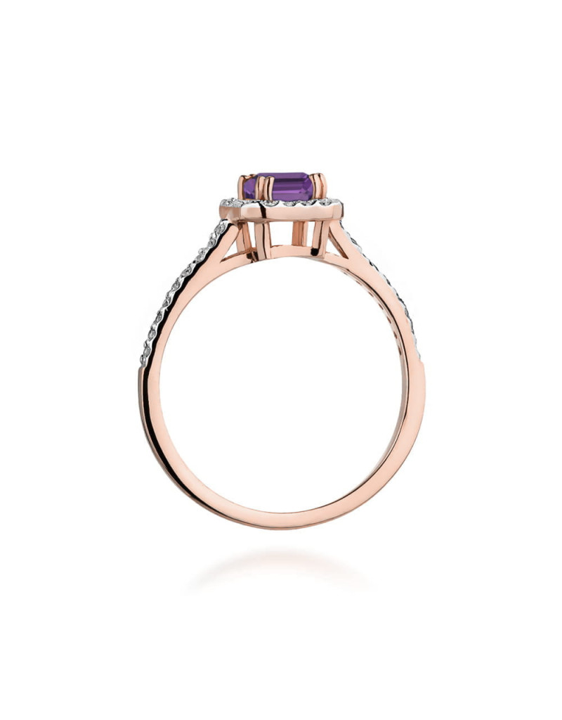 Pierścionek z ametystem i brylantami w różowym złocie, niepowtarzalny wzór, idealnie pasuje na delikatną kobiecą dłoń. Model idealnie łączący tradycje i nowoczesność.