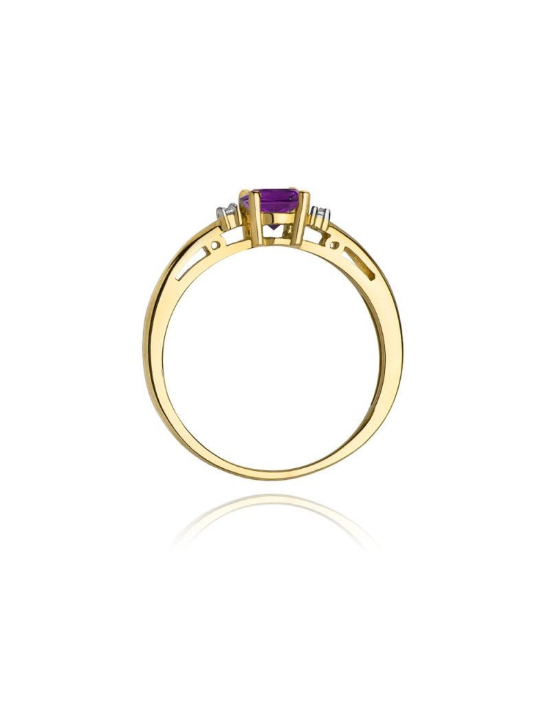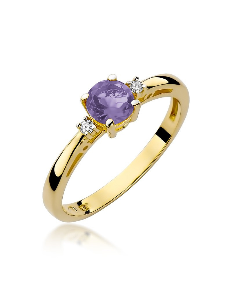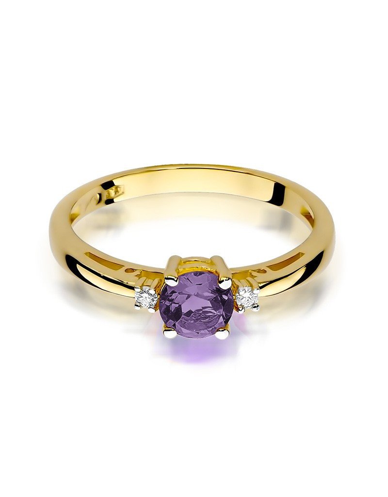 Pełen elegancji i klasyki pierścionek z żółtego złota z ametystem i 2 brylantami w czteroramiennej koronie.