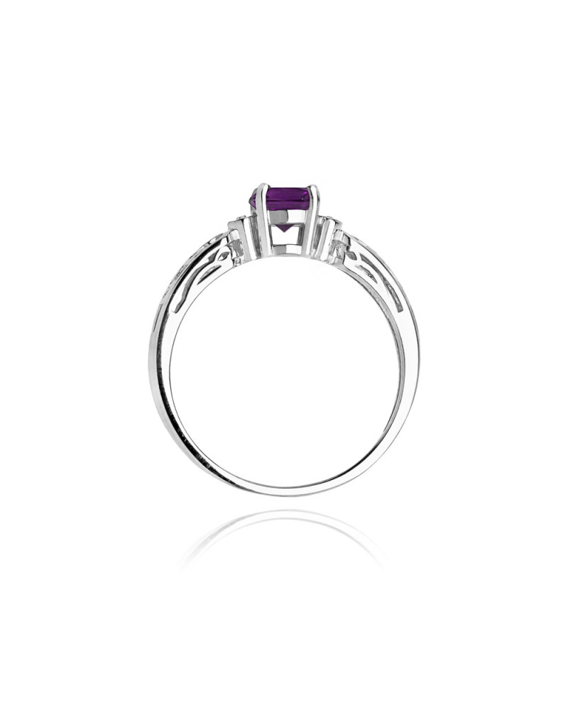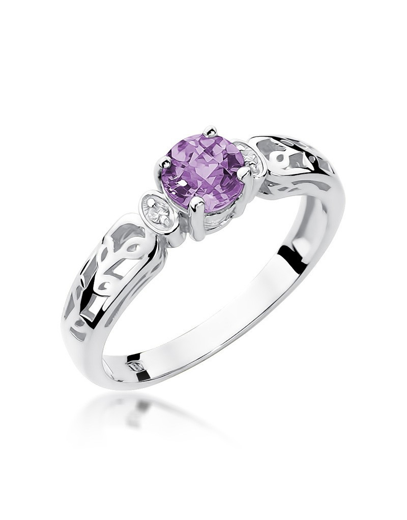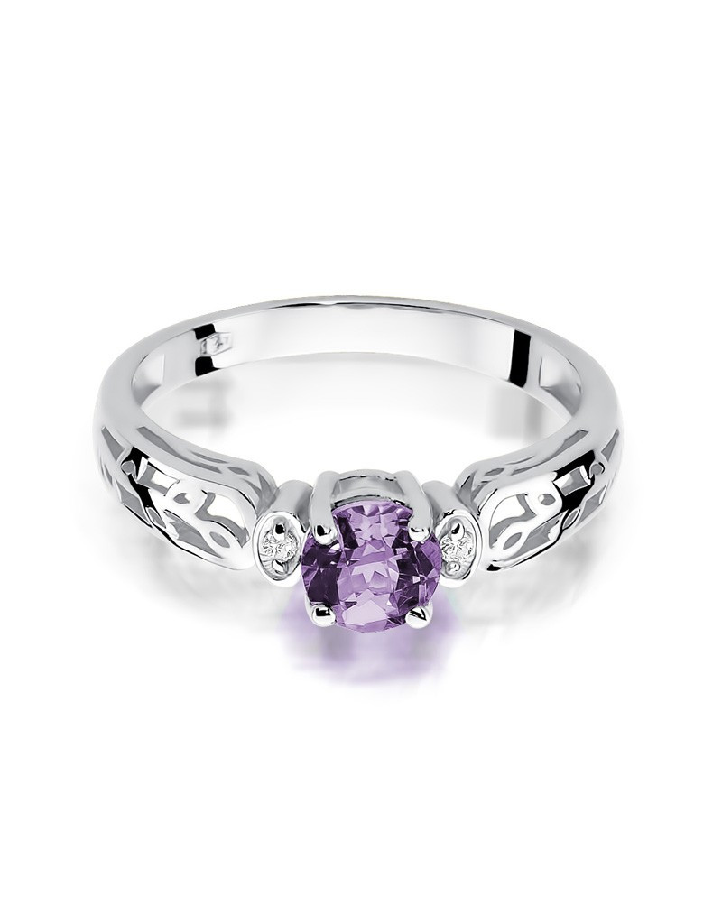 Pierścionek o finezyjnych kształtach z okrągłym ametystem w czteroramiennej koronie i brylantami.