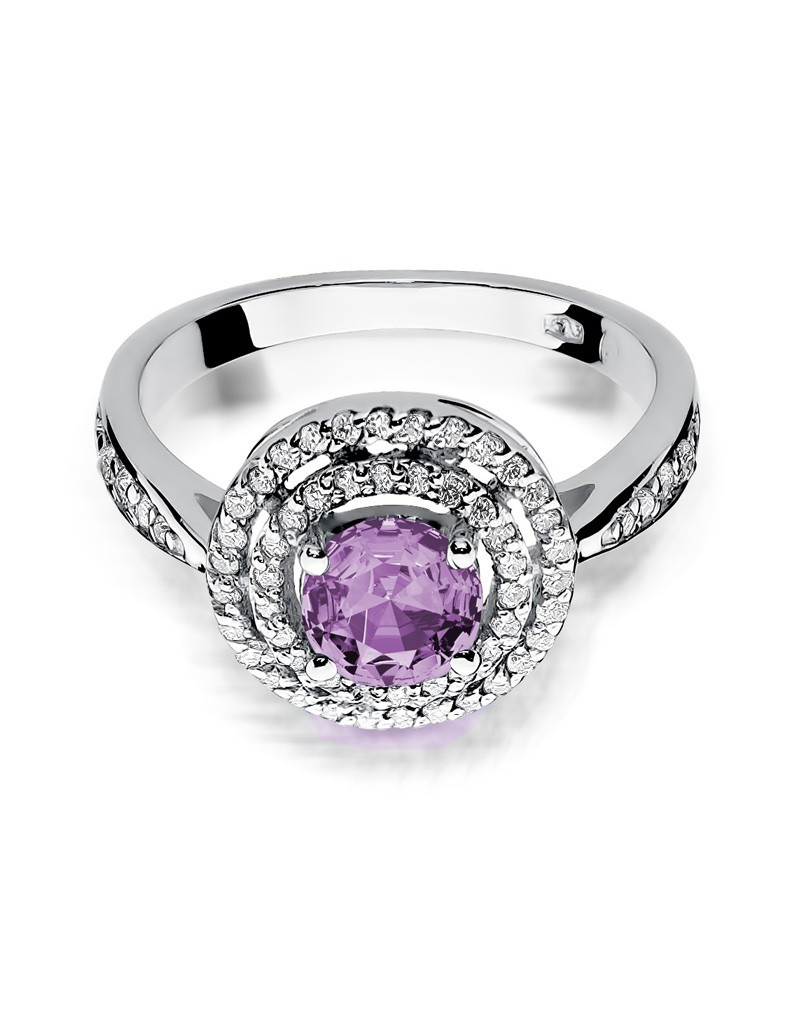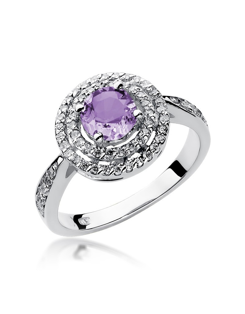 Pełen uroku pierścionek wykonany z białego złota ze zjawiskowym ametystem i 62 brylantami które dodają mu blasku.