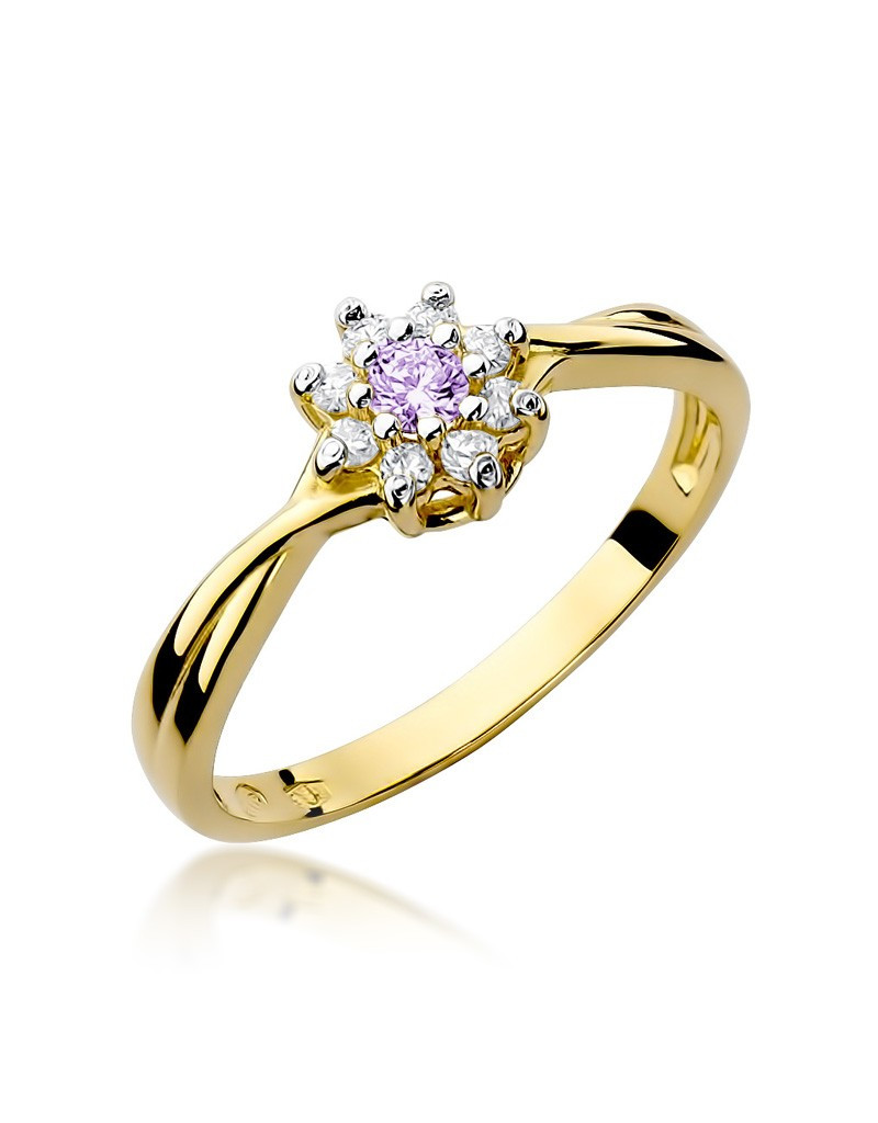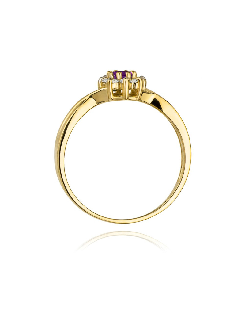 Pełen uroku pierścionek z żółtego złota ze szlachetnym ametystem i lśniącymi brylantami w formie kwiatuszka.
