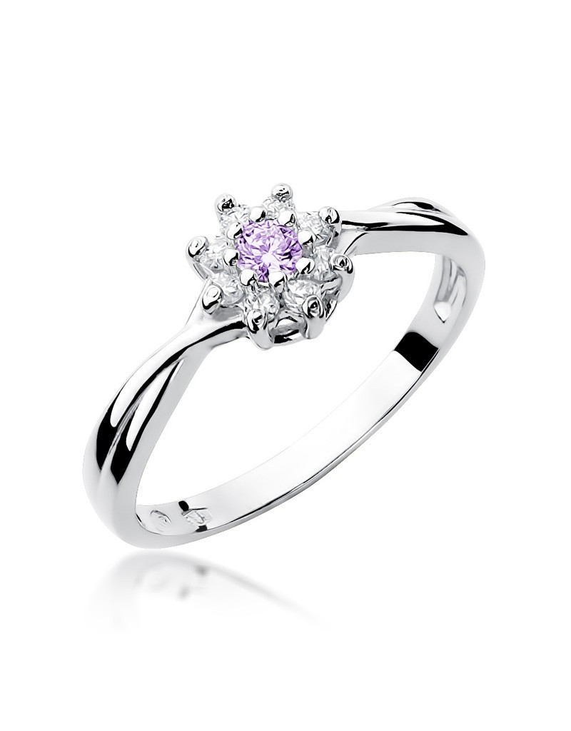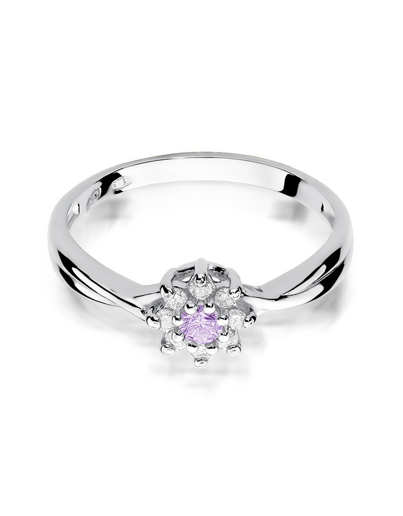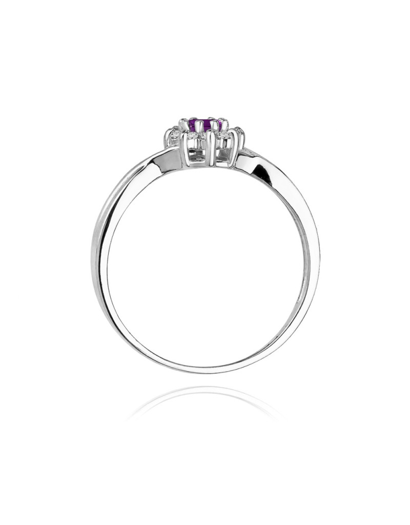 Pełen uroku pierścionek z białego złota ze szlachetnym ametystem i lśniącymi brylantami w formie kwiatuszka.