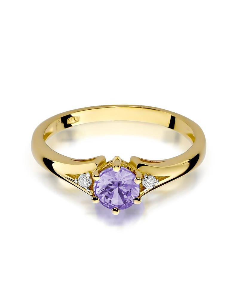 Zjawiskowy pierścionek z żółtego złota z okrągłym ametystem i brylantami.