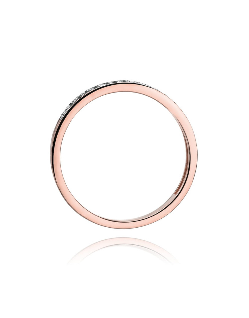 Delikatny pierścionek z różowego złota z pełną blasku szyną wysadzoną czarnymi brylantami.
